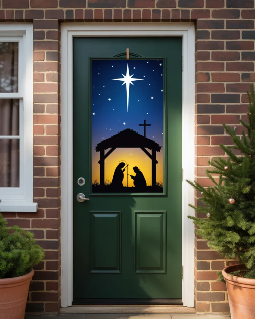 For a meaningful Christian take, a nativity scene using silhouette cutouts and backlighting creates an elegant and spiritual impact. It’s a simple way to incorporate faith into a Christmas door, ideal for churches, schools, or home entryways. Add twinkling lights for reverent beauty.