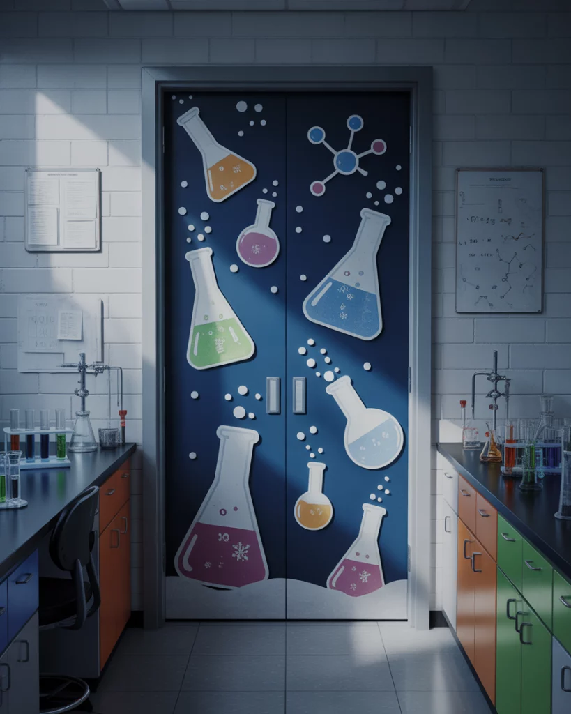 Infuse your holiday decor with scientific wonder by transforming a classroom door into a wintry lab scene. Decorate using colorful beakers, glass flasks with “frozen” liquids, glowing LED lights, and paper-cut snowflakes. Add decorative elements like microscopes, molecular shapes, and ice crystal motifs. This idea works well for STEM-themed spaces and is ideal for middle or high school school settings. It’s festive, simple, and creative—perfect for a contest entry with a clever twist that doesn’t rely on words or characters.