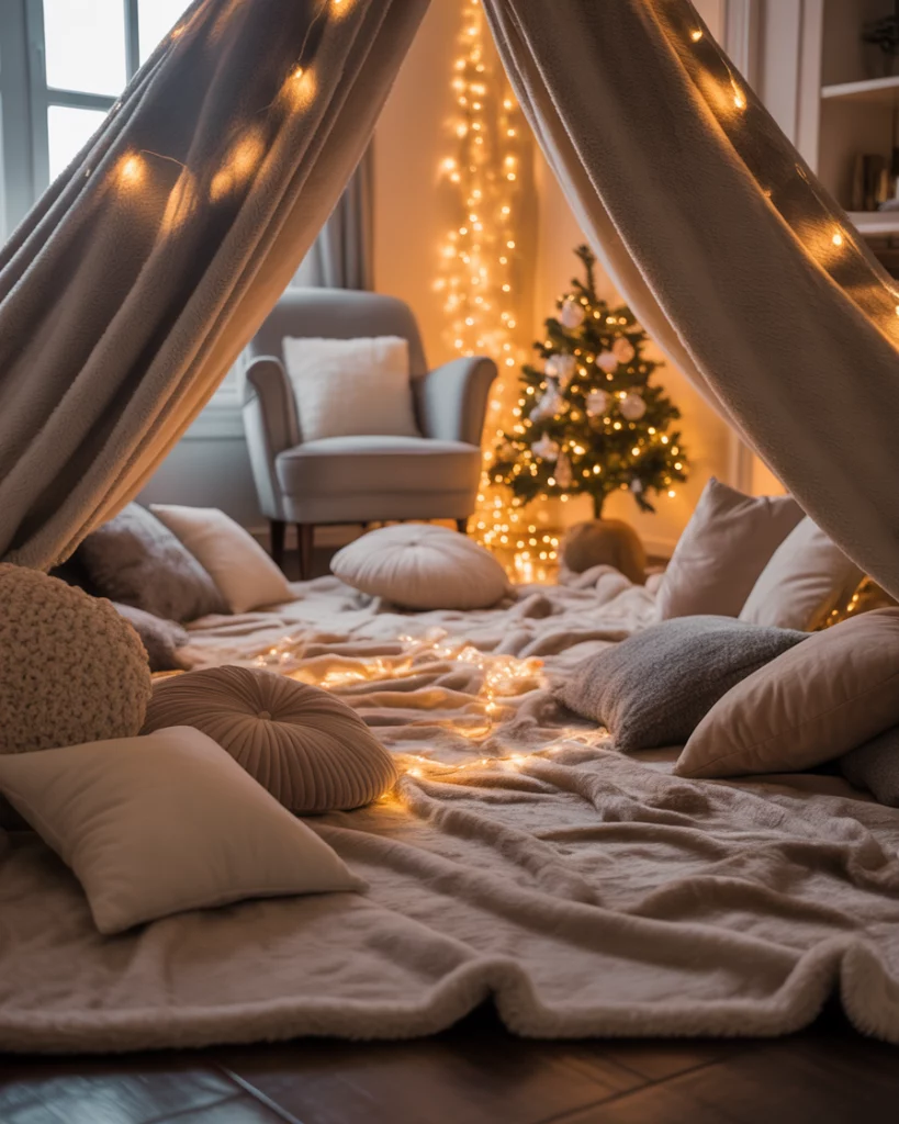 Not only kid friendly! This concept turns any corner into a cocooned and warm hideaway with thick blankets, twinkle lights and holiday pillows. Put in a small tree on a tabletop and serve hot cocoa or wine. An excellent concept among couples, flatmates, or even the individual snugglers. It is a nostalgic, but adult version of Christmas coziness–one of those concepts that are diy easy and make people happy without much effort.