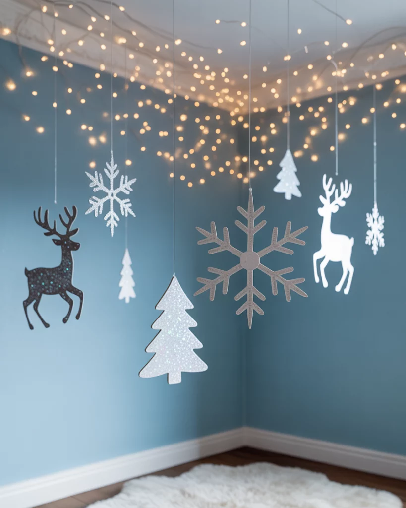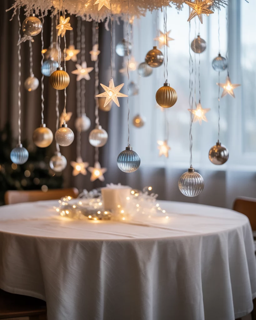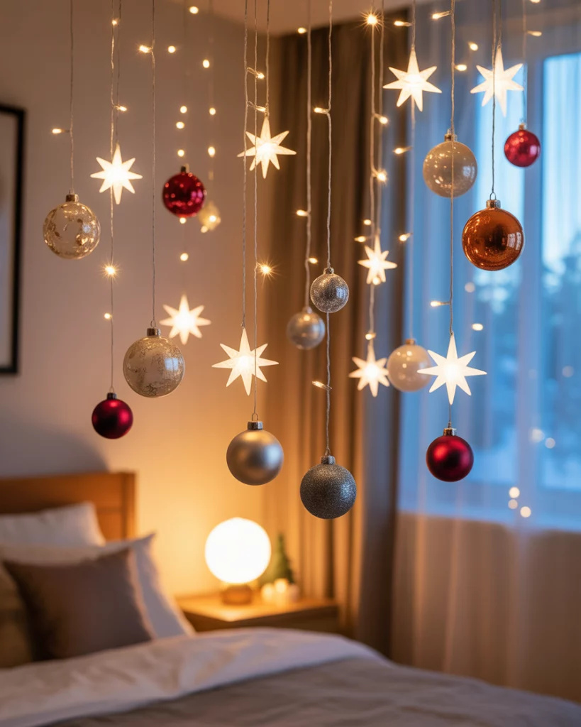 Hang your decor on the floor and in the air by making a hanging Christmas installation. Hang ornaments, stars and paper snowflakes using clear fishing wire over a table or bed. The concept will be best suited to small apartments or multipurpose rooms. It is one of those ation concepts that introduce vertical drama without consuming space. It has a couple of diy touches.