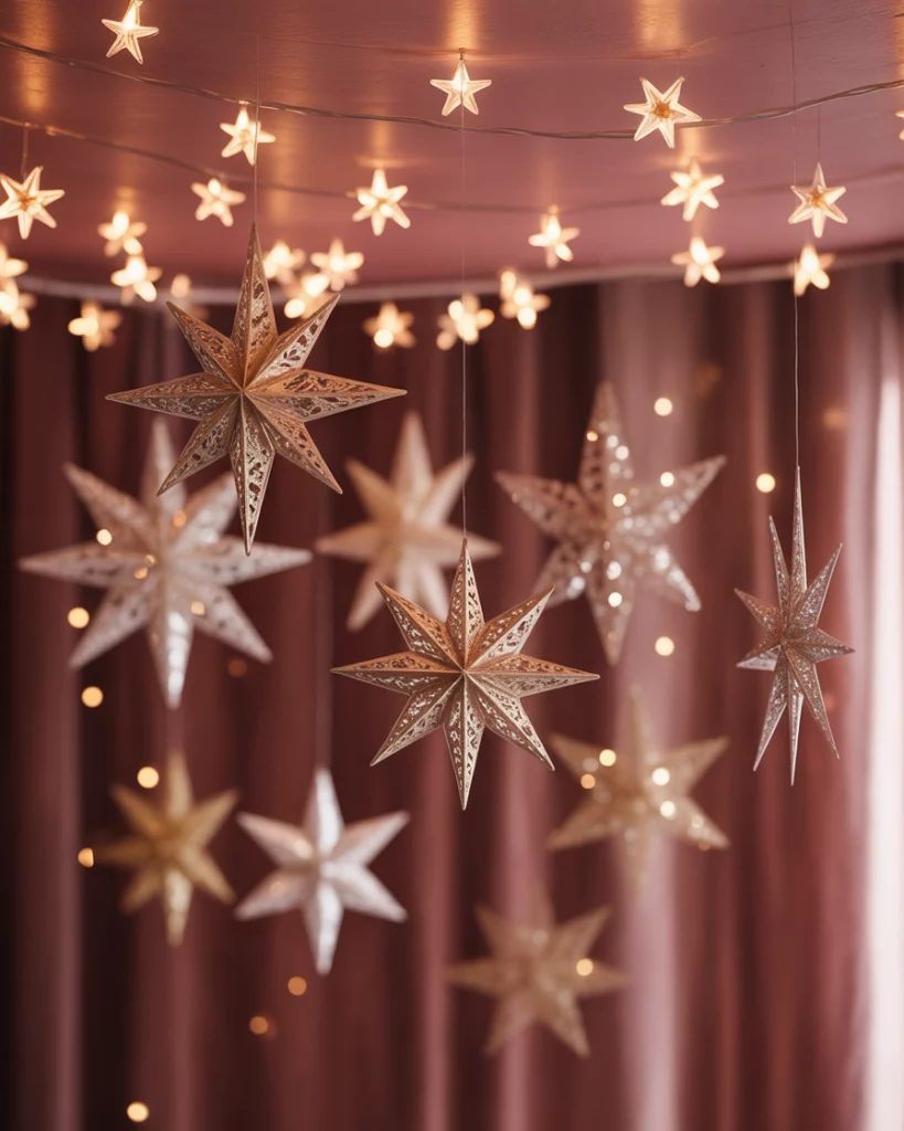 Suppose you lie with a glowing sky, indoors. Decorate your ceiling with LED stars, cutout paper stars and tinsel meteors. This enchanted concept brings the drama and magic to any room. To create a diy solution, create stars out of glitter paper and hang them with transparent strings. It is one of the most magical ation concepts that transform bedrooms or lounges into dream worlds.