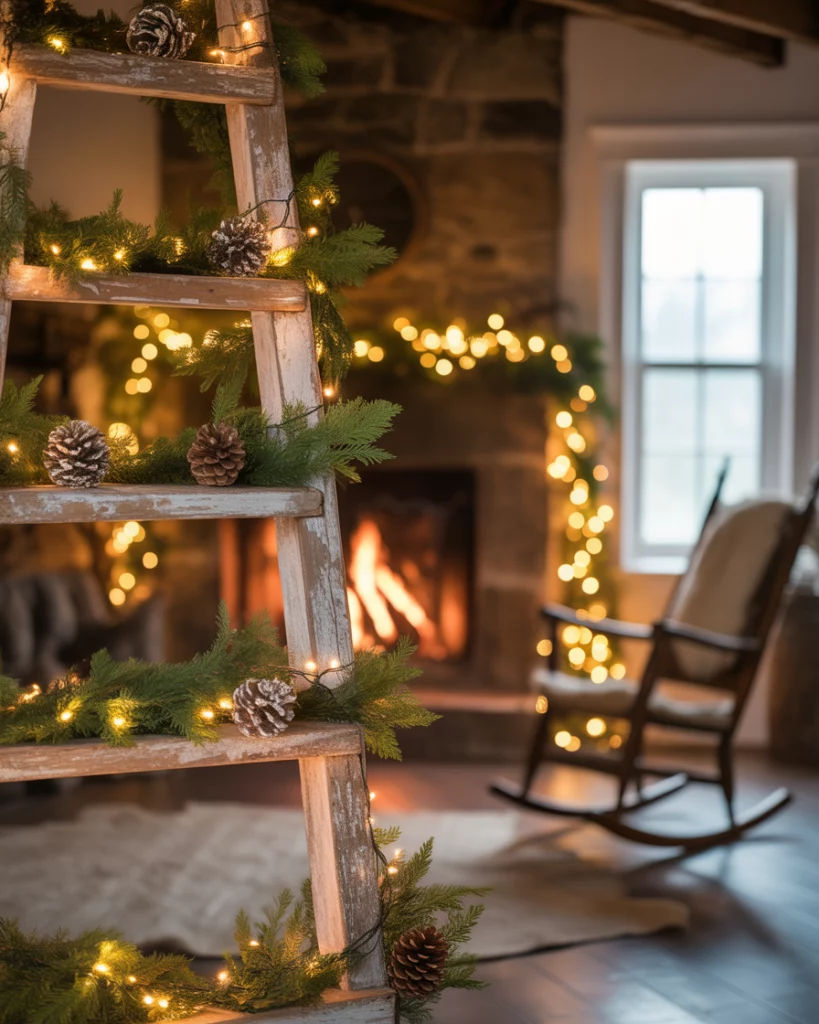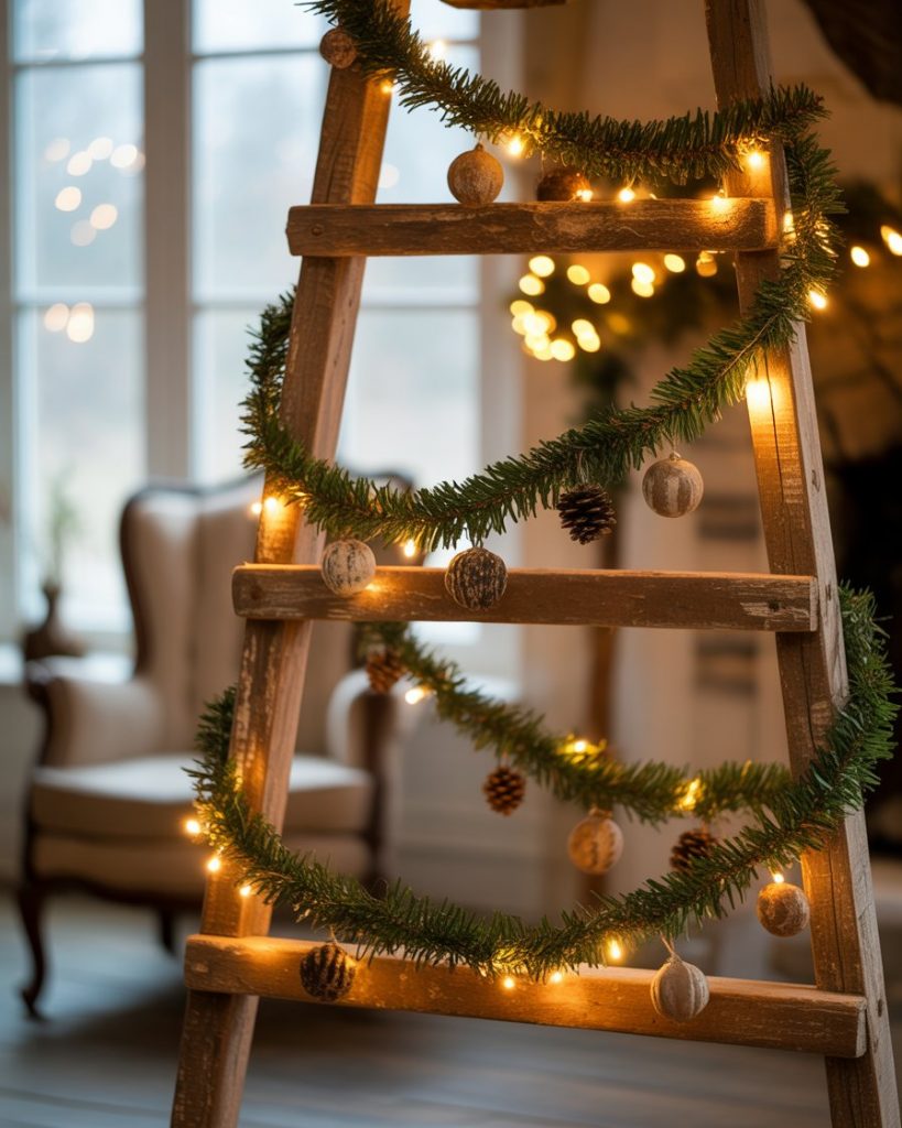 Reuse a wood ladder into a lovely tree-like centerpiece. Dress up the rungs with garlands, lights and hanging ornaments. It is a homey version of traditional decor and one of the most ingenious concepts diy small spaces or farmhouse decor. Place pinecones and mini gift boxes to finish the appearance- a photo-friendly focal point.