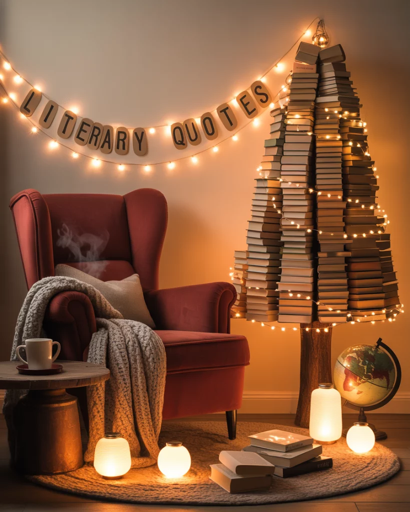 Create your own bookish reading nook into a Christmas retreat. Arrange books into a tree, use literary quotes in the form of garlands and use soft lighting. This is among the cleverest concepts diy on the part of readers and writers. Add a pink blanket to add a small festal touch. An introvert, bookworm or page-magic retreat.