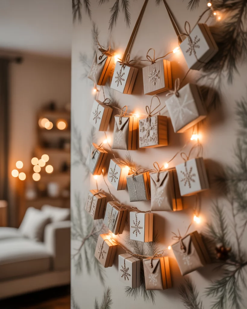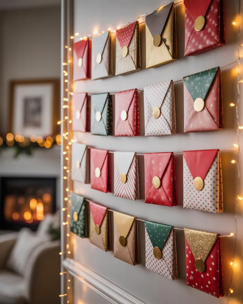 Why not make your countdown one to count upon? Take mini envelopes, bags or boxes that are set up like an art wall. Within each: a message, small gift or treat. It is one of those concepts that are diy easy, not only fun, but also a big conversation starter. Avoid damage by using command hooks or washi tape. It works well in doorways or in walls of the family room that require festive affection.