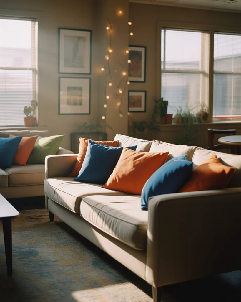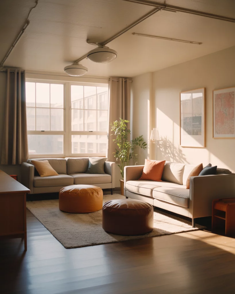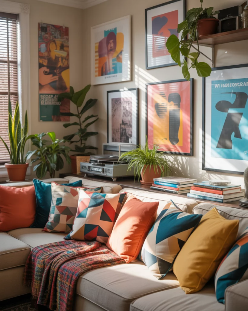 Students still want personality, just without permanence. Living room fun decor like bold pillows, playful art, and colorful throws delivers impact. These choices align with Inspo living room trends that favor flexibility and self-expression. Where it works best is in shared apartments. Temporary decor avoids conflicts over long-term style decisions.