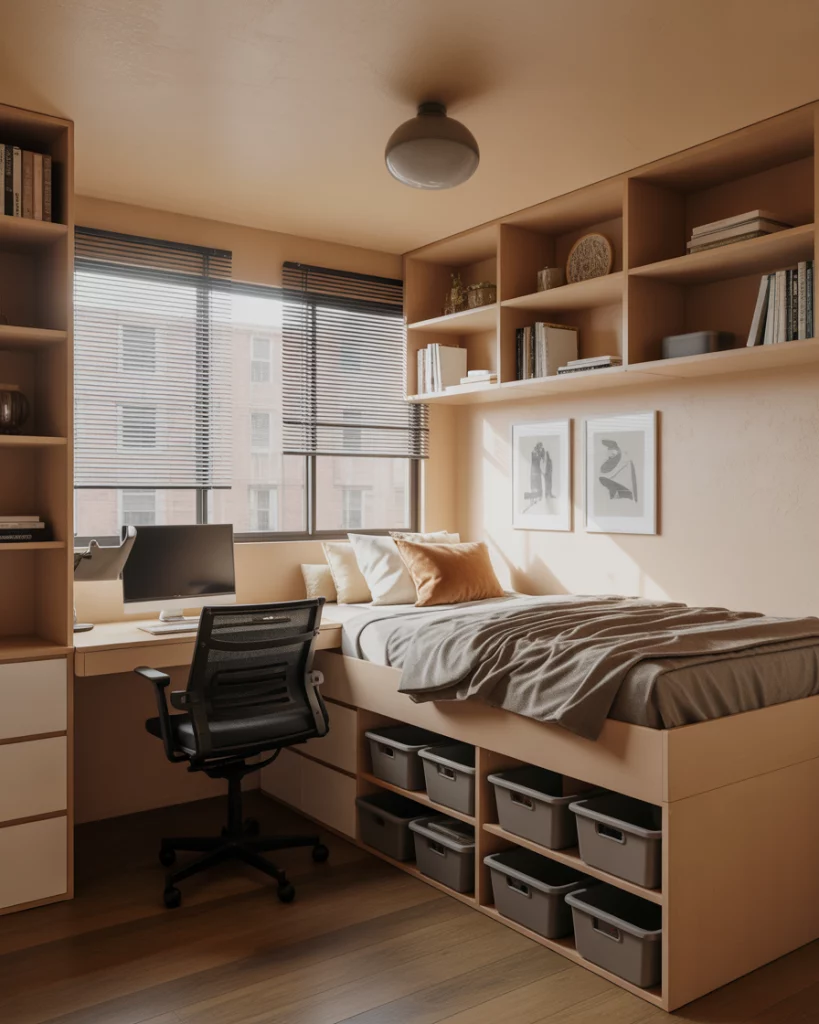 Making the most of limited square footage is central to A budget bedrooms small spaces planning. In college apartment decor 2026, creativity matters more than size. Wall-mounted shelves, under-bed storage, and slim furniture keep rooms functional. Mixing in ating bedroom touches like layered textiles adds personality without clutter. The budget angle is key here. Most of these upgrades cost less than a textbook. Prioritizing multifunctional pieces saves money long-term and reduces the urge to replace furniture every move.