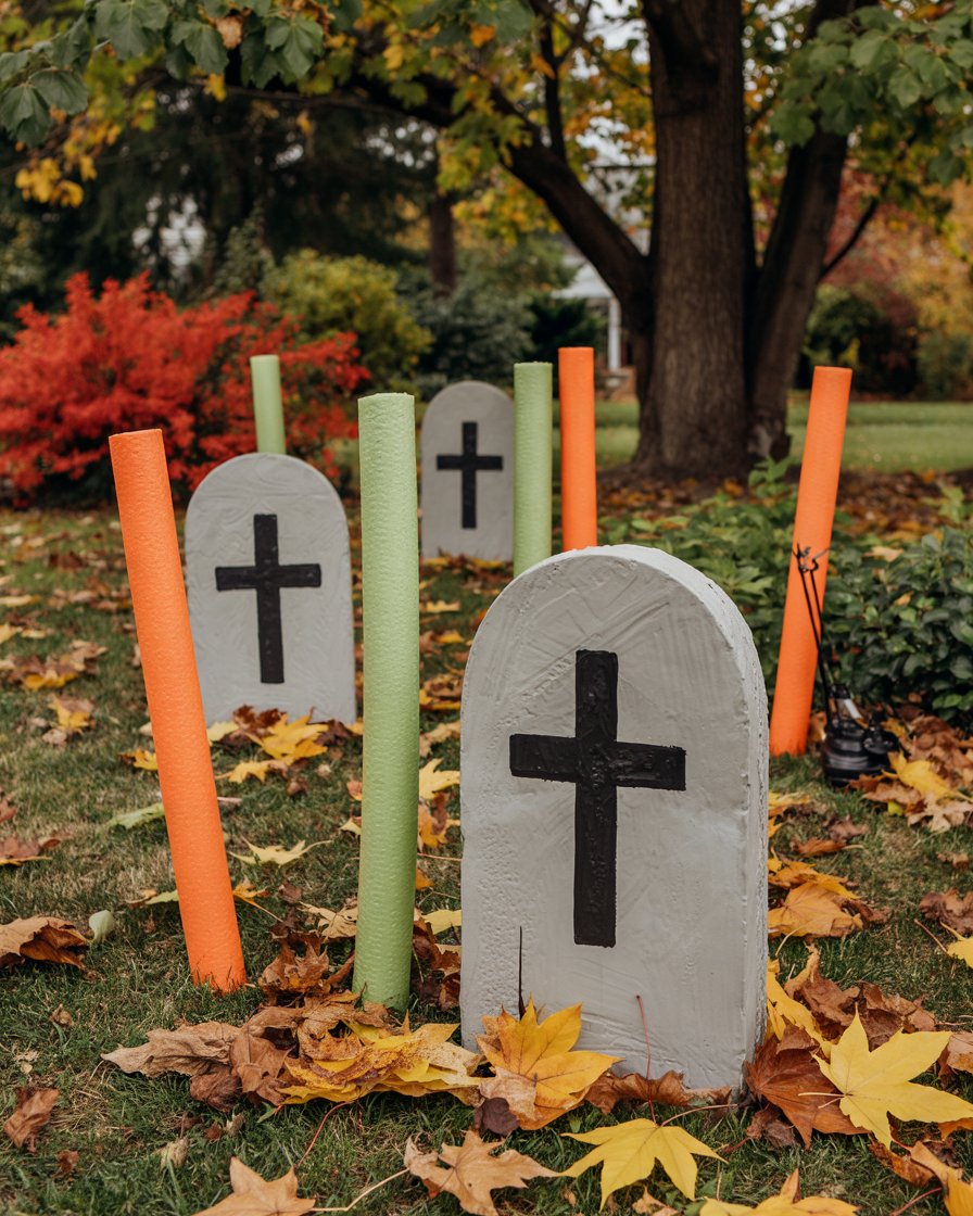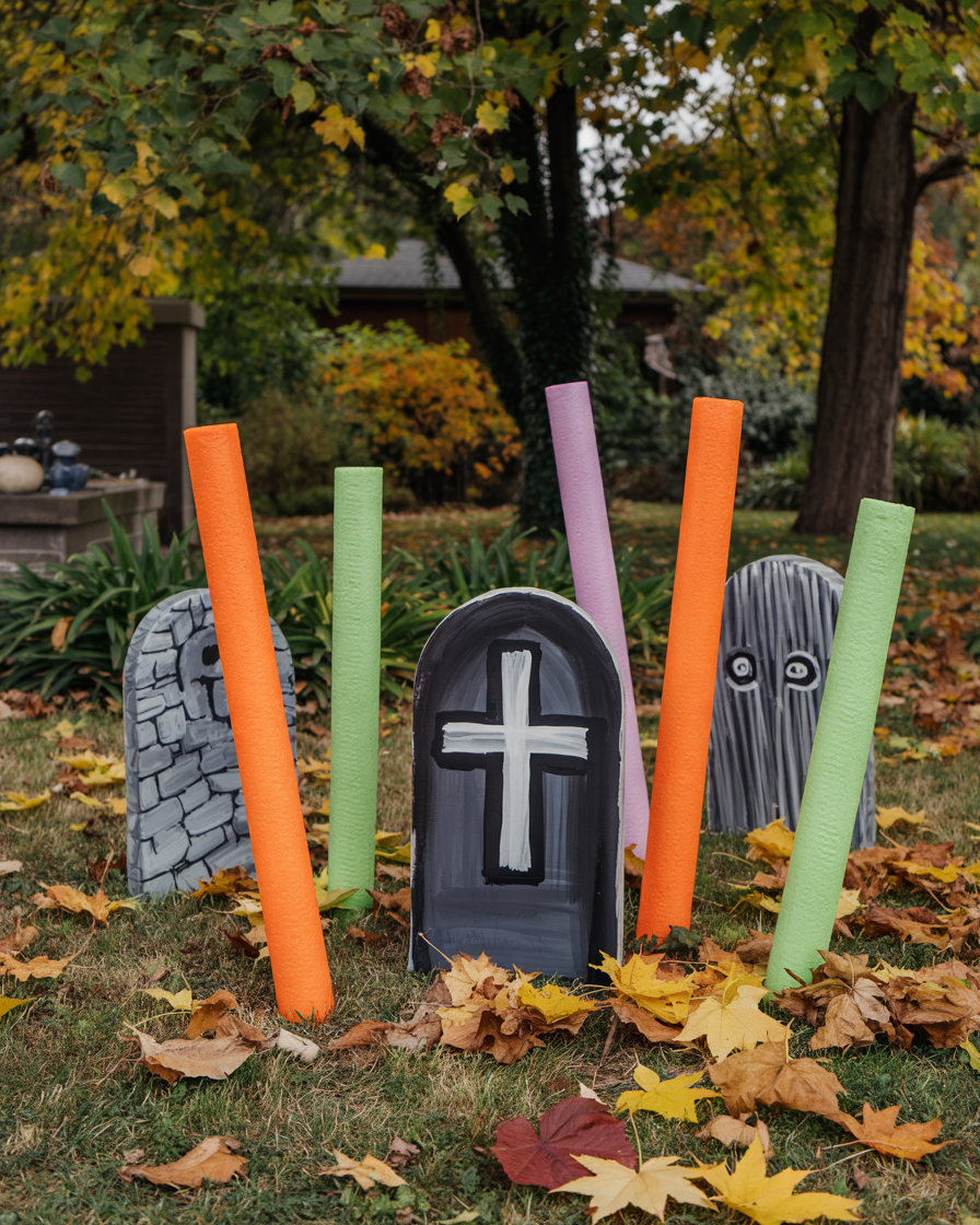 Turn inexpensive pool noodles into eerie tombstones for your outdoor yards simple Halloween setup. Chop them up into different heights, cover them in duct tape, paint them with stone-textured spray paint and label them with drawing style text such as RIP or good-natured ghost puns. They are less in weight, of low cost and weather-friendly and are thus suited to the decoration of easy places in the yard front porches. Kids can help with the painting, making it fun for kids and a bonding moment for the family.