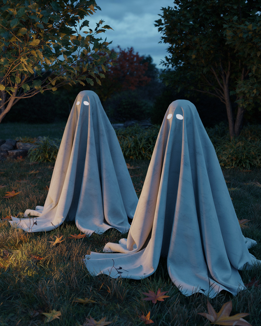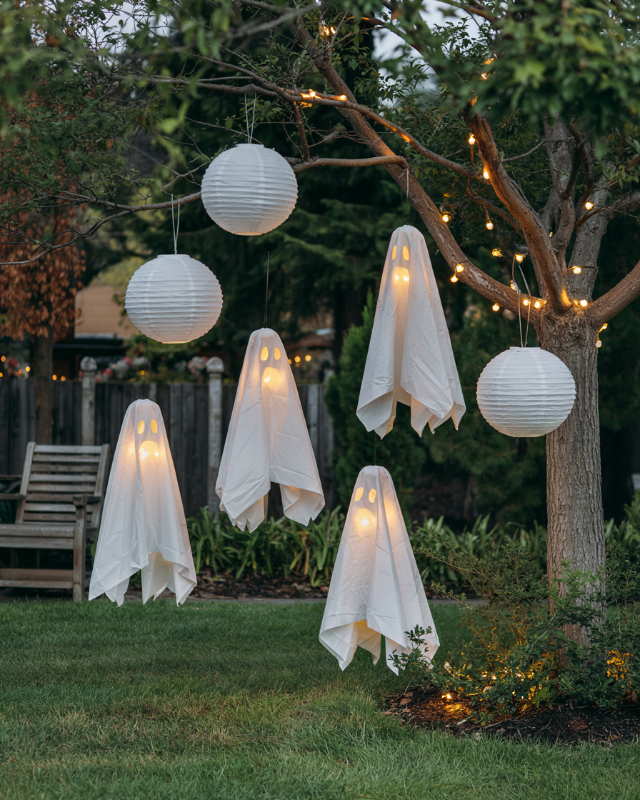 Use old white sheets stuffed with leaves or fabric to make large ghost figures for outdoor yards. You can make scary or friendly faces depending on whether you want fun for kids or a spookier vibe.