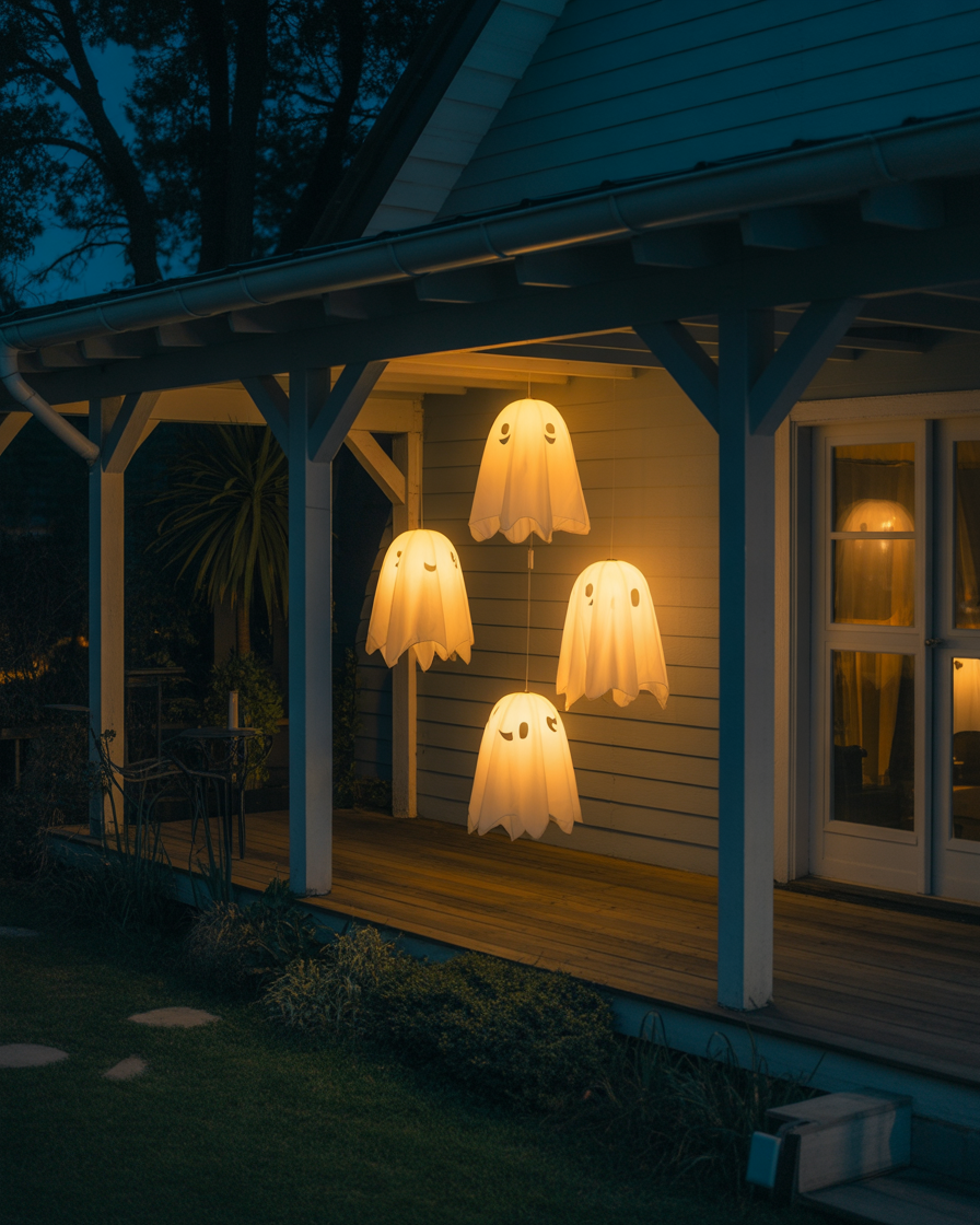 White paper lanterns can be turned into cute or scary ghosts by drawing faces on them and hanging them from trees in outdoor yards or in a kids bedroom. It’s easy, cheap, and looks cute for kids, especially with string lights inside for a glow.