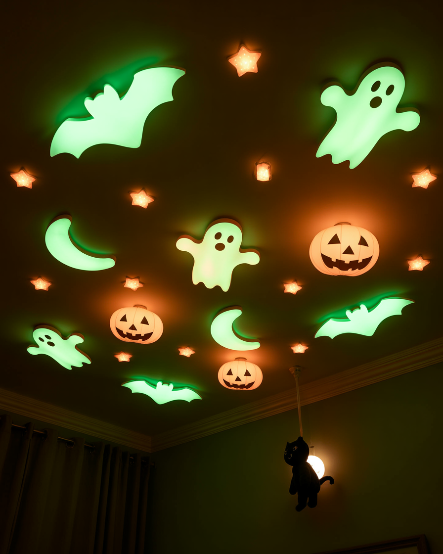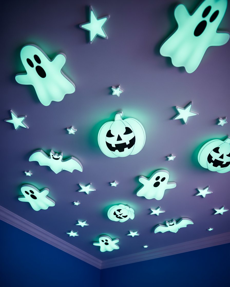 Take regular glow-in-the-dark stars and mix in Halloween-themed shapes like ghost, bats, and pumpkins cut from paper. In a kids bedroom, this makes a magical yet slightly scary nighttime scene.