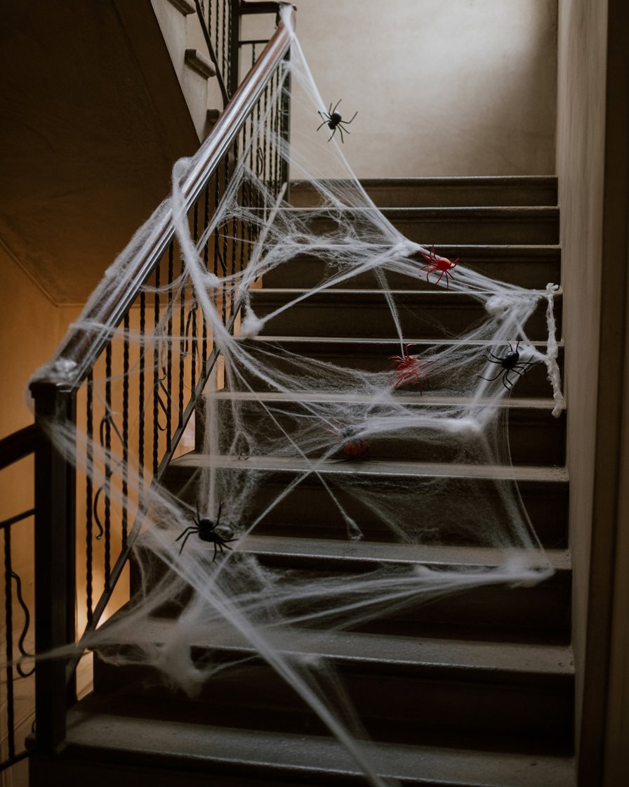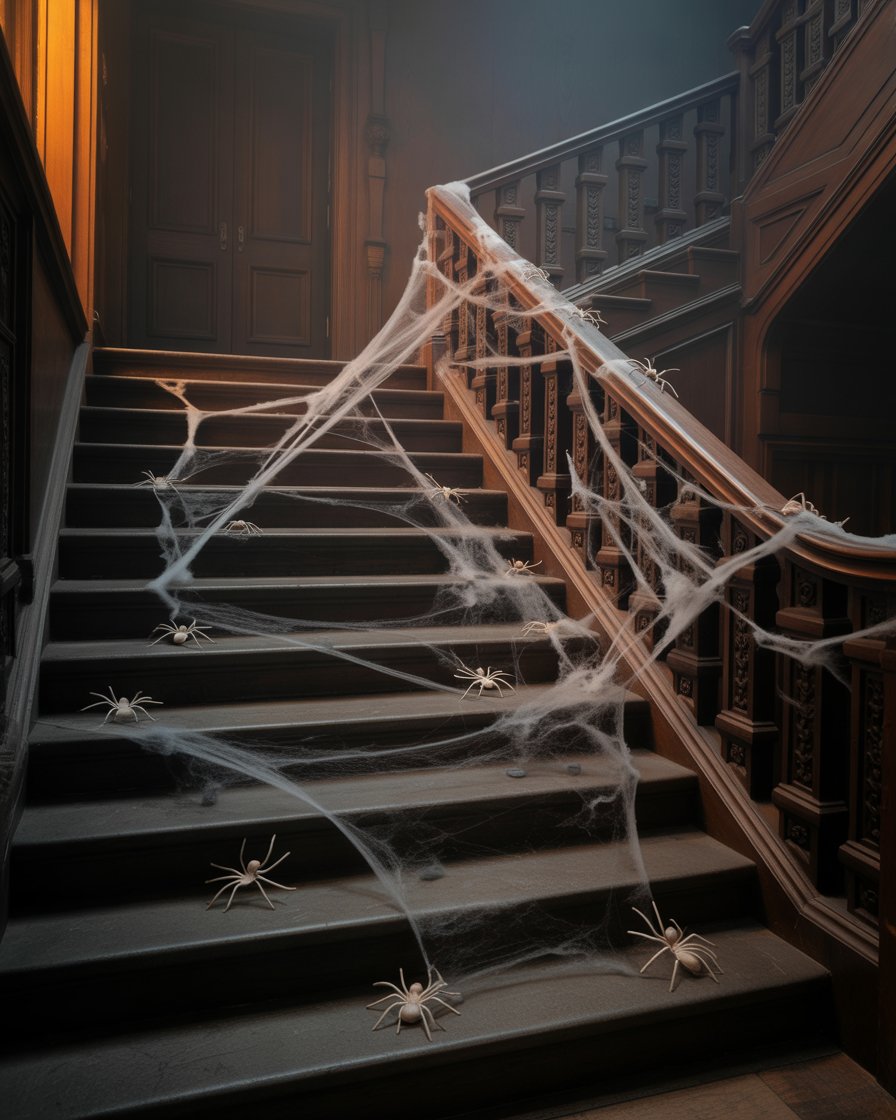 For your indoor staircase or porch, use synthetic spider webs (sold at dollar tree) and plastic spiders to transform it into a creepy passage. Works great for both indoor party setups and outdoor yards front porches easy.