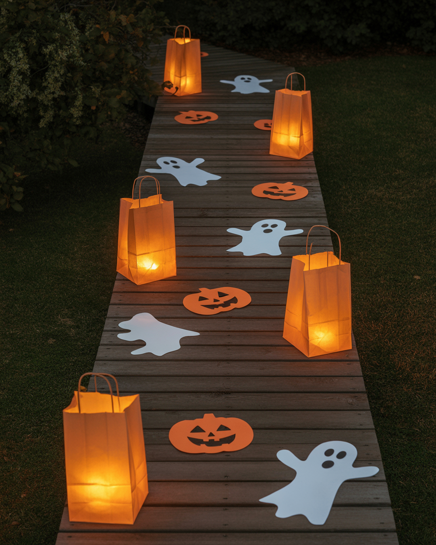 Cut Halloween shapes—pumpkins, ghost, bats—into plain brown paper bags, then place LED candles inside. These are cute, safe, cheap and they can work outdoors in yards with simple walkways or in party tables in the house. Great for kids crafting.