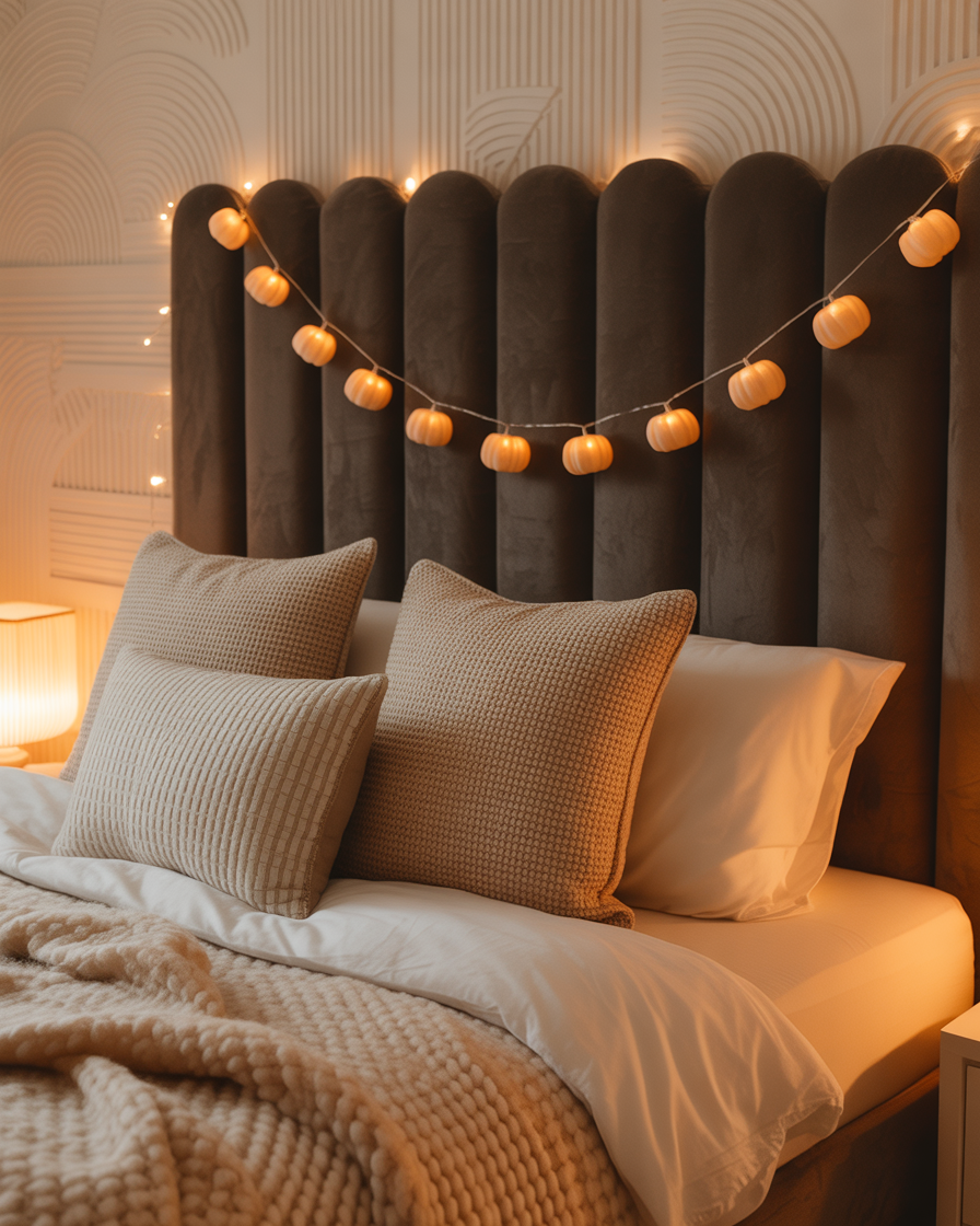 Hang a garland of mini pumpkins (plastic pumpkins) with small lights inside across your bedroom wall or headboard. It’s aesthetic, easy, and perfect for inside to bring cozy autumn evenings to life.