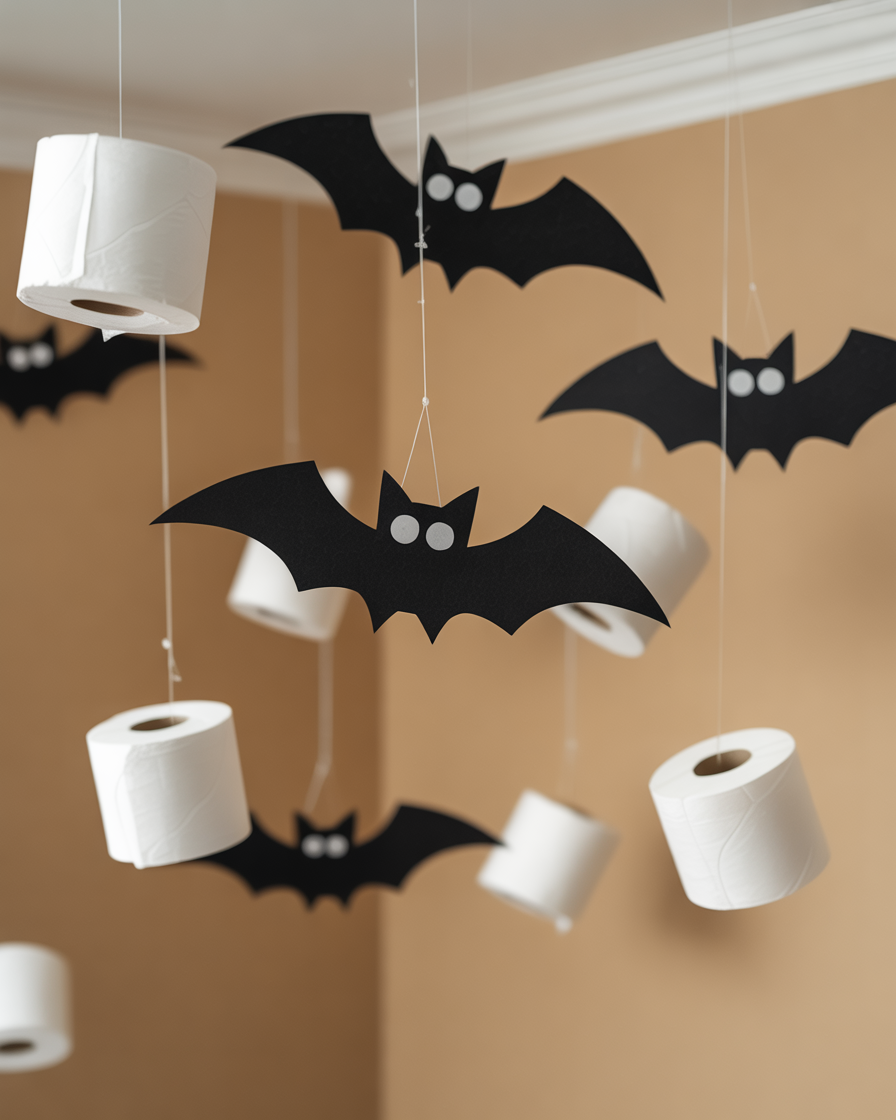 Transform empty toilet paper rolls into adorable or scary bats for indoor and outdoor yards simple décor. Colour them black and turn up the tops so that they come out like pointed ears, then put paper wings at the sides. Hang them from ceilings for indoor party fun or from trees for kids to spot in the yard.