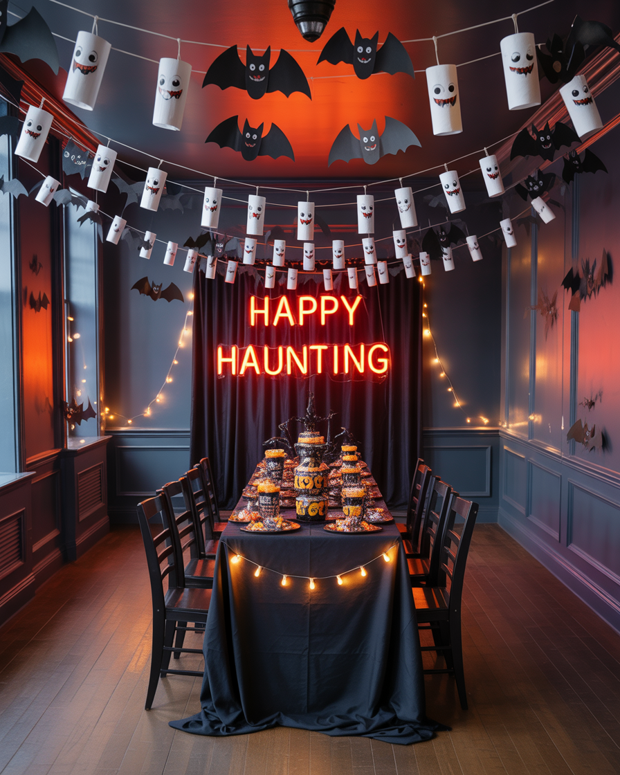 Recycle toilet paper rolls into a whimsical indoor ghost garland. Wrap them in white tissue paper, give them black eyes and hang them up to create a cute effect to hang inside the kids room or on a comfy indoor party. It can be done quite simply and cheaply, and it adds that drifting, esthetic spooky appeal. This is also a great dollar tree crafting project for rainy October afternoons.