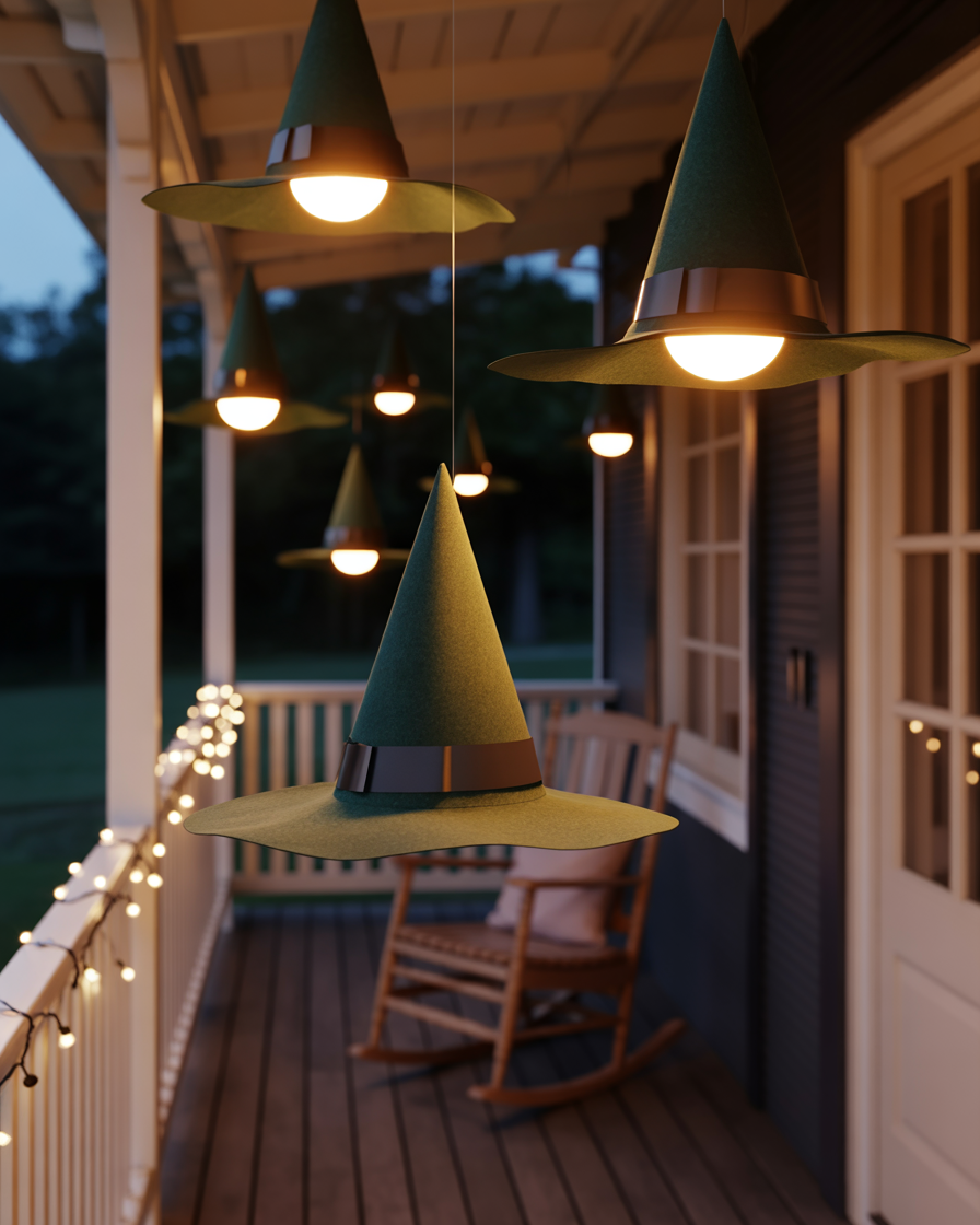 Suspend lightweight witch hats with fishing line in your outdoor yards front porches easy or living room. Place LED lights inside so they glow at night. This easy and aesthetic project works for both indoor gatherings and front porch displays.