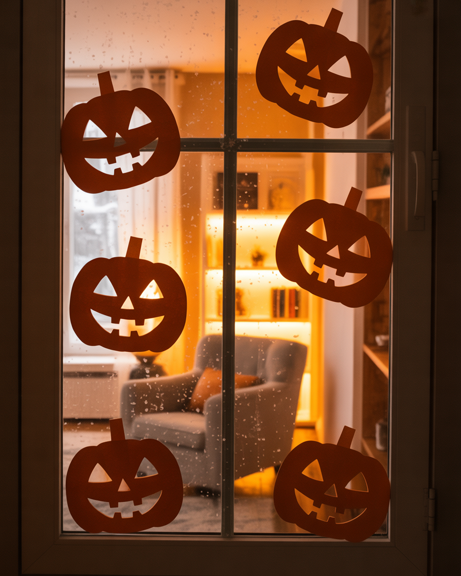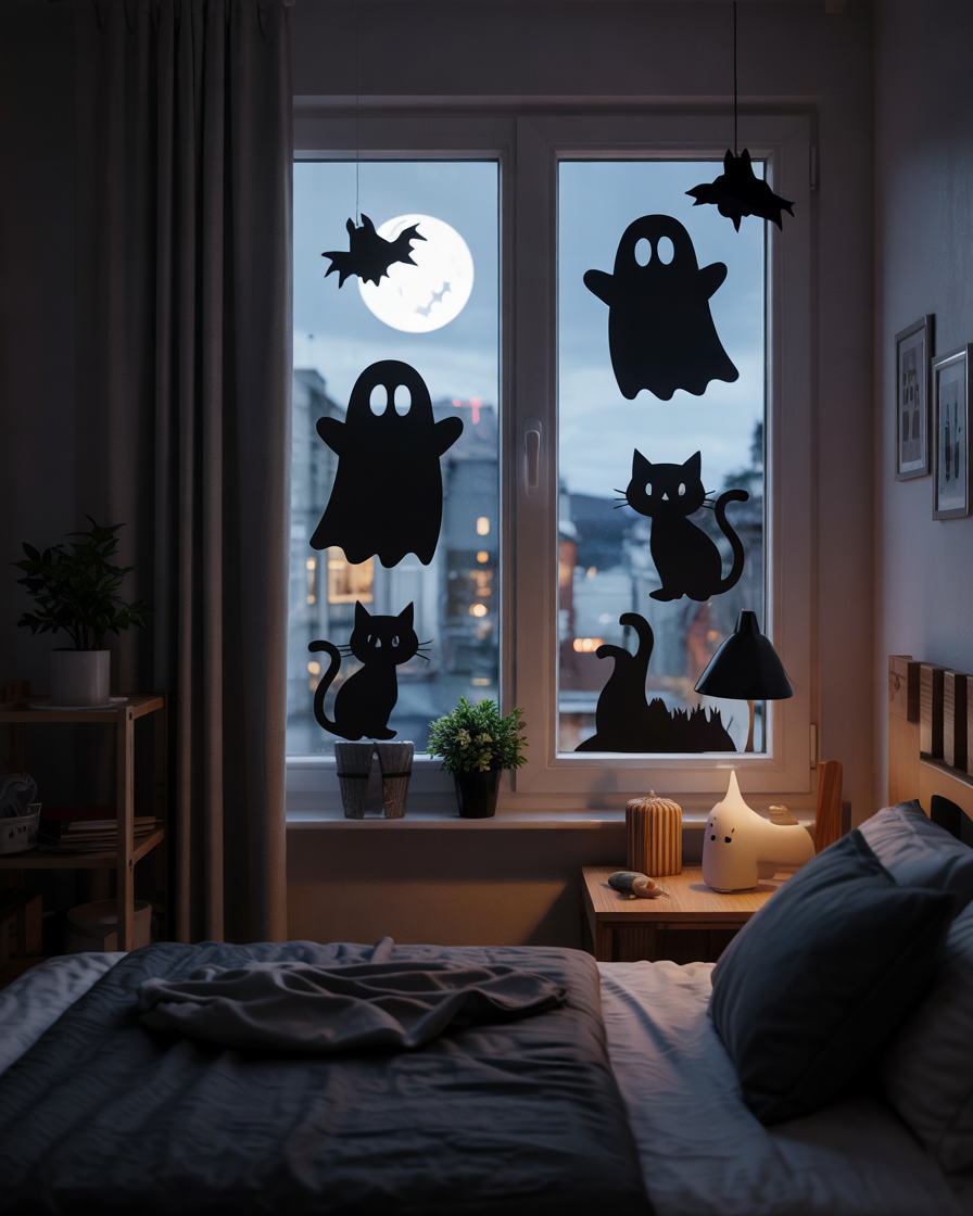 Cut spooky shapes—hands, spiders, monsters—from black paper and place them along hallway walls, lighting them from below for indoor party effects. It is simple, great indoors and it immediately elevates the mood. Kids love spotting them, especially in their bedroom.