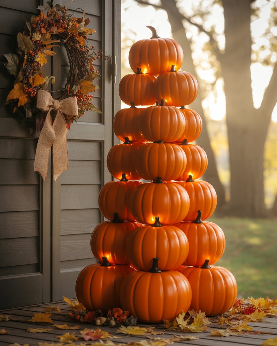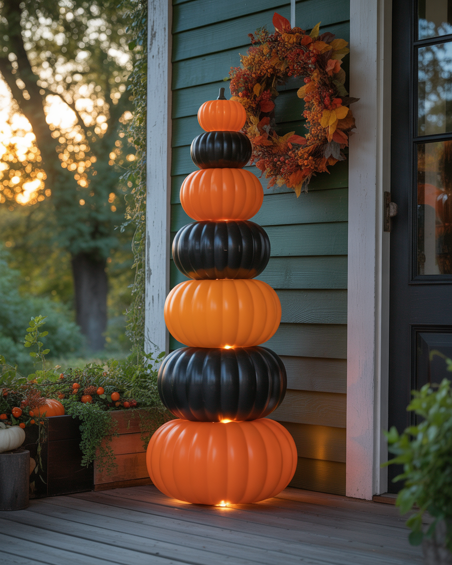 Stack plastic pumpkins into a vertical tower for a striking outdoor yards or indoor decoration. Stick together, cut out holes to allow the light through and drop LED candles into it to make a warm pleasant looking light. It is inexpensive, is durable for the scale of years and all can be personalized by cutting out typed paper. Perfect for kids to help assemble.