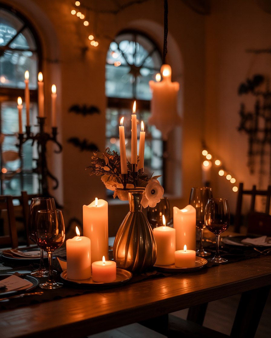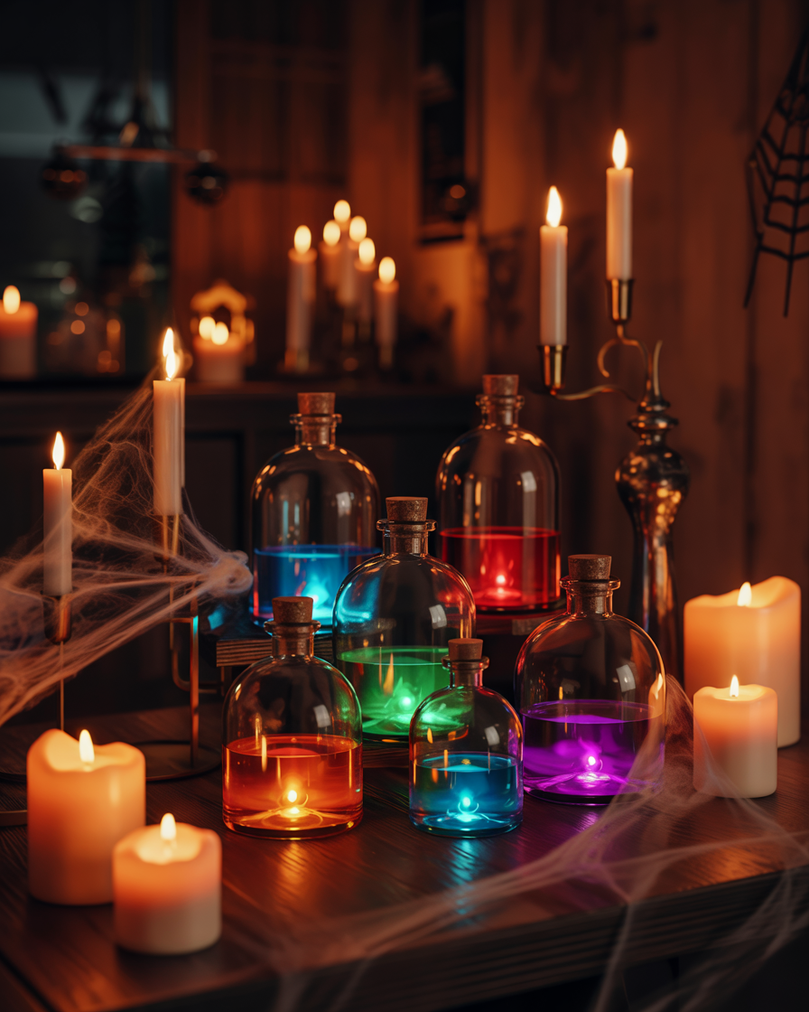 Inspired by wizard movies, hang LED candles from the ceiling with fishing line for a floating effect at your indoor party. They’re lightweight, easy, and safe around kids. Add tattered fabric above for a scary haunted-house vibe, or keep it aesthetic and magical.