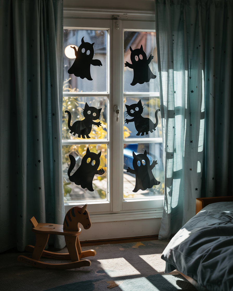 For a kids bedroom twist, cut Halloween silhouettes (ghost, black cat, witches) from paper and tape them to the inside of windows. They look crazy and harmless in the evening when the lights are turned on indoors and castchastic shadows outside. It’s a fun way to decorate for kids without cluttering the room.