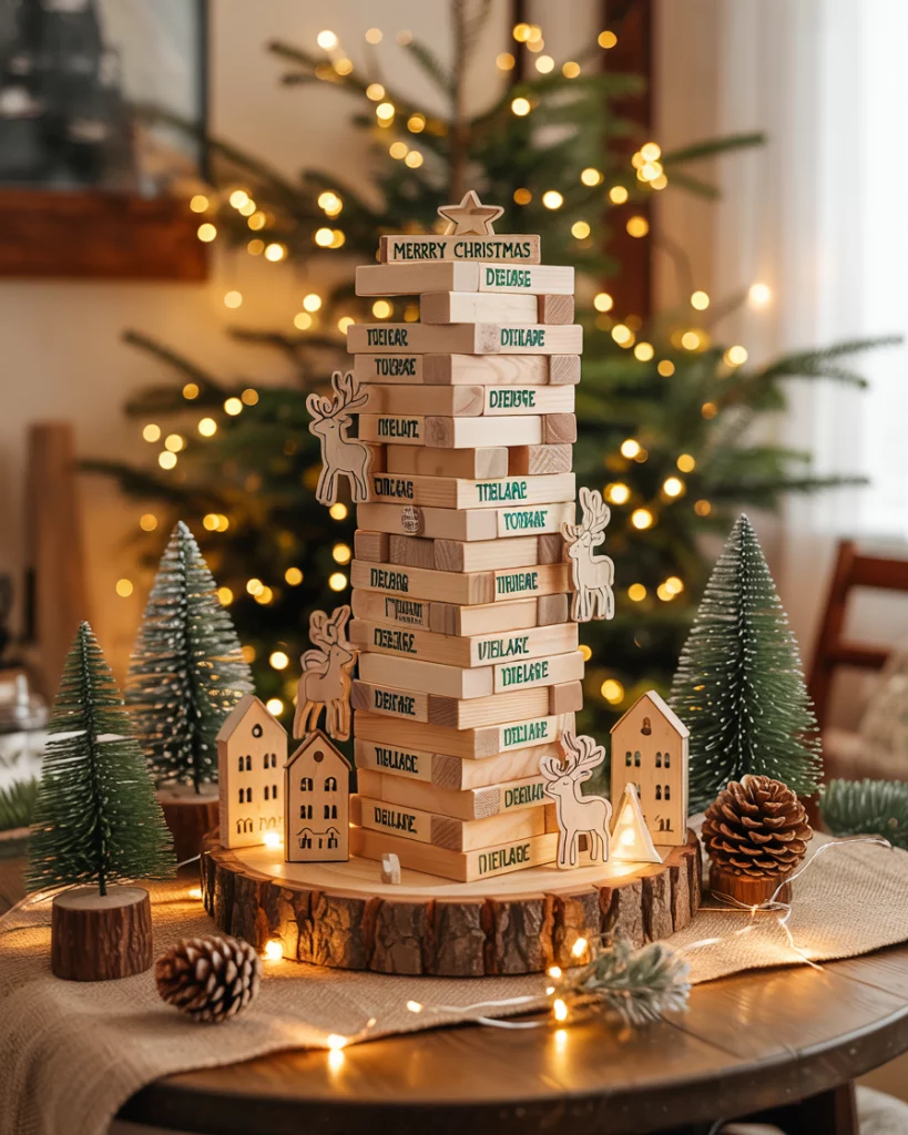 One of the most underrated Dollar Tree Christmas decor hacks is using tumbling tower blocks — their version of Jenga — to create custom ornaments, centerpieces easy, and even deer silhouettes. These jenga block crafts are super versatile and lend a rustic charm to your tree or table. Paint them white and add glitter for an elegant vibe, or go full red-and-green for a classic look. They’re perfect for DIYers who love small-scale builds with big impact.