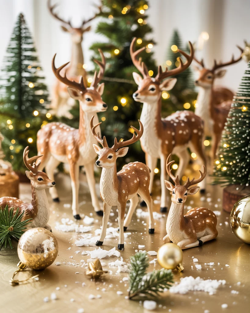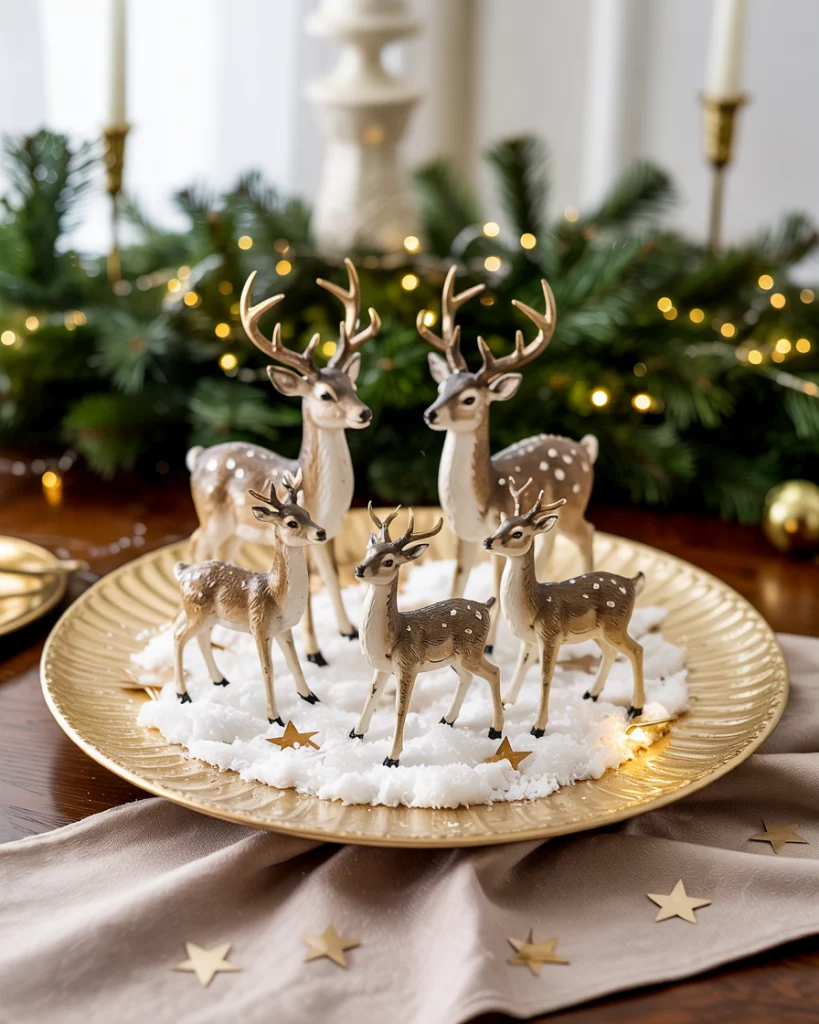 Use Dollar Tree’s metallic deer figurines and spray-paint them gold or white for an elegant tabletop scene. Combine them with faux snow, tiny trees, and mirrored trays. This is one of those easy diy crafts that looks high-end but takes less than 20 minutes. It works beautifully for your holiday dinner table or entryway console.