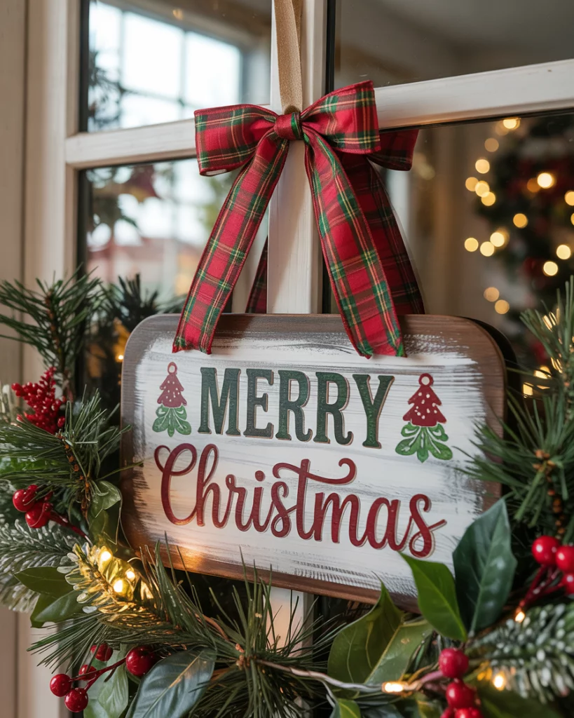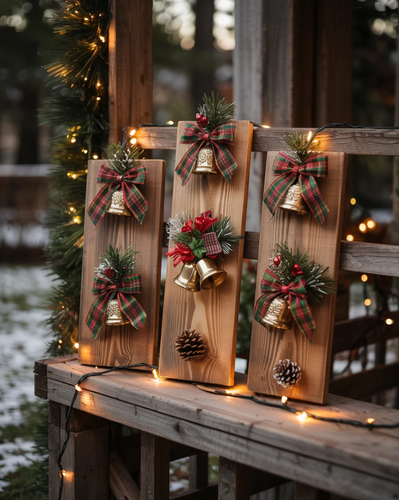 Dollar Tree’s blank wood signs are perfect for crafting charming outdoor Christmas decorations with a rustic twist. Instead of focusing on lettering, paint the boards in festive colors like deep red, forest green, or whitewash. Decorate them with plaid bows, pinecones, faux greenery, and miniature bells. Lean them casually against planters, lanterns, or porch railings. These decoration ideas add a cozy farmhouse vibe to your porch, driveway, or outside entryway and look especially inviting when paired with twinkling lights.