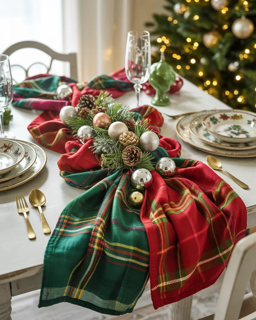 You’d never guess it, but Dollar Tree winter scarves can be stitched or layered to make a stunning elegant Christmas table runner. Choose plaid or metallic styles, then add mini ornaments or pinecones along the center. It’s one of those craft ideas that’s both creative and functional. Perfect for a table centerpiece or buffet setup — and so much cheaper than store-bought runners.