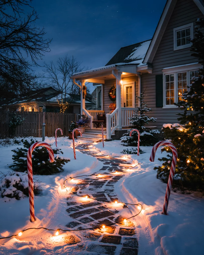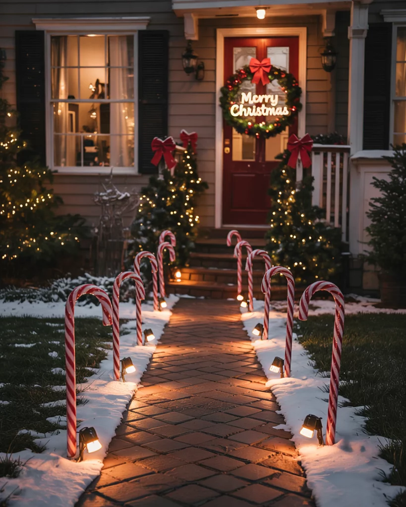 Light up your outside walkway with outdoor candy cane stakes from Dollar Tree. Line them up along your driveway or porch steps, intertwining them with battery-powered lights for extra glow. It’s a classic holiday look that’s playful and nostalgic. These decorations diy are a hit with kids and neighbors alike and are one of the easiest ideas diy to set up — no tools required.