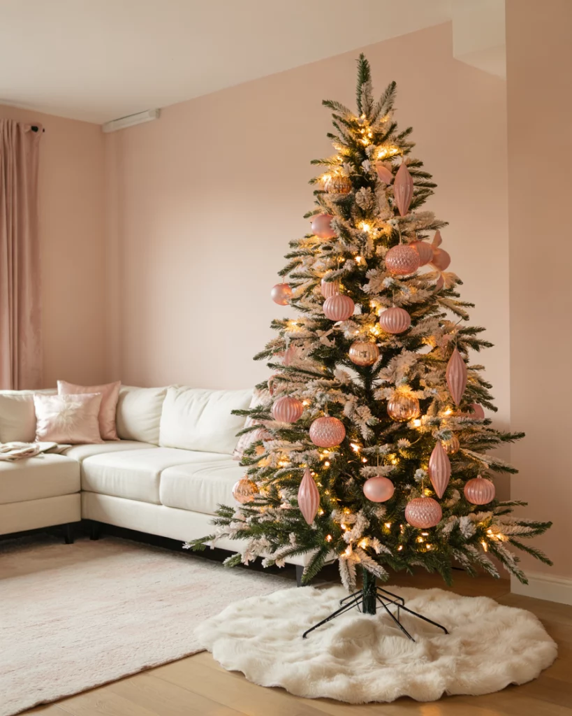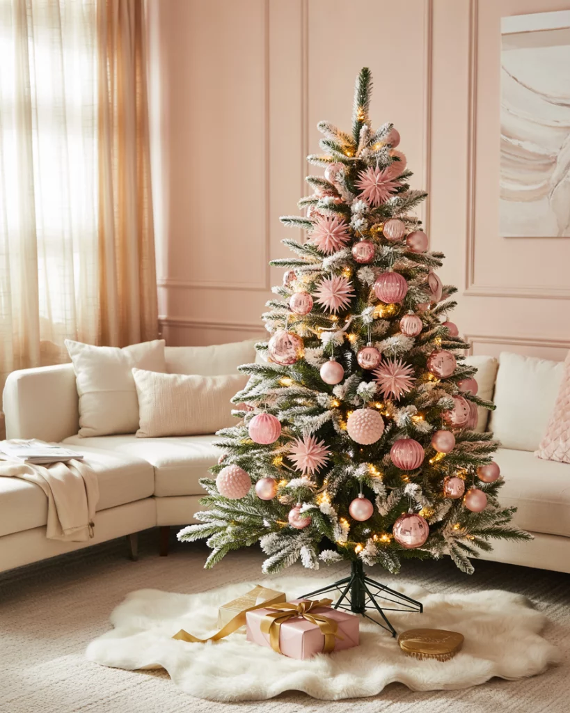 If you’re into trendy and chic holiday looks, go for a pink tree theme. Use Dollar Tree pink ornaments, florals, and bows to decorate a white or blush-colored tree. Pair it with gold and white accents for an elegant and modern twist. This style is especially popular for beauty salons, dorm rooms, or a glam corner in the living room.