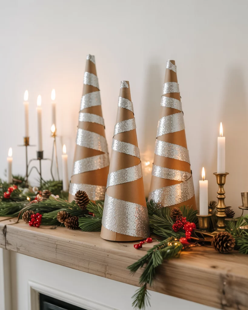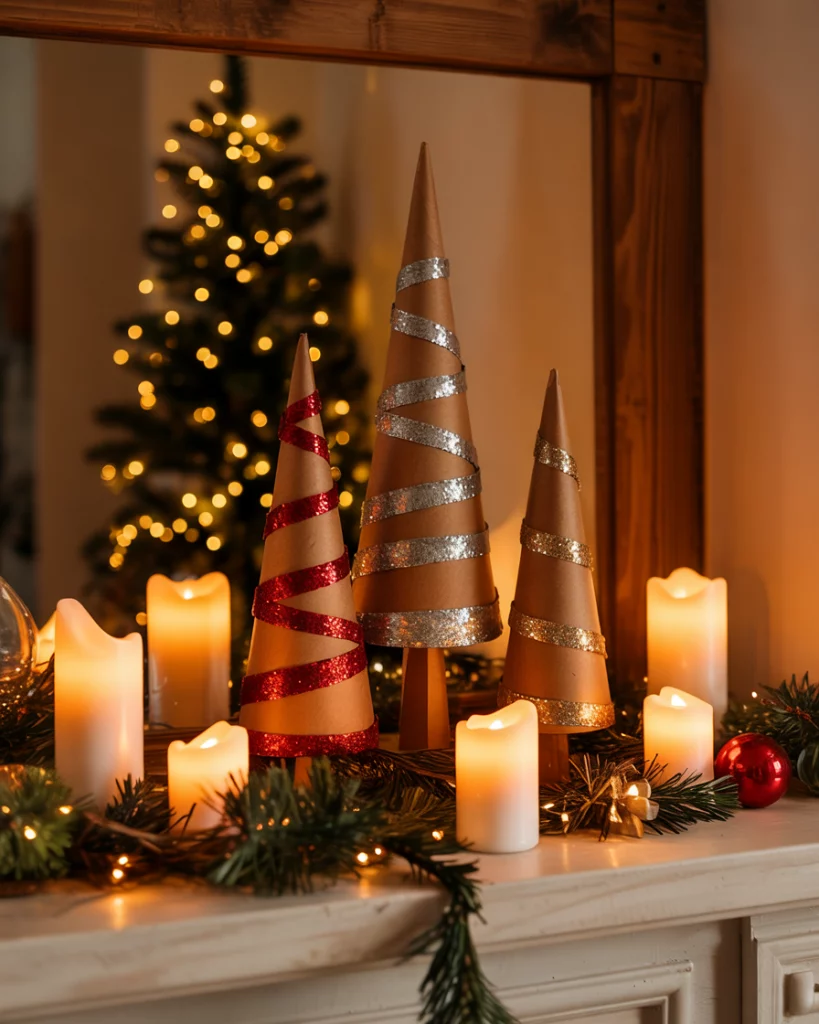Create your own decorative cone trees using Dollar Tree poster board, glitter paper, or ribbon. Wrap the cones in fabric, twine, or mini lights for texture. These crafts look stunning on mantels, entryway tables, or as a centerpiece easy enough for beginners. A trendy and cheap alternative to store-bought décor.