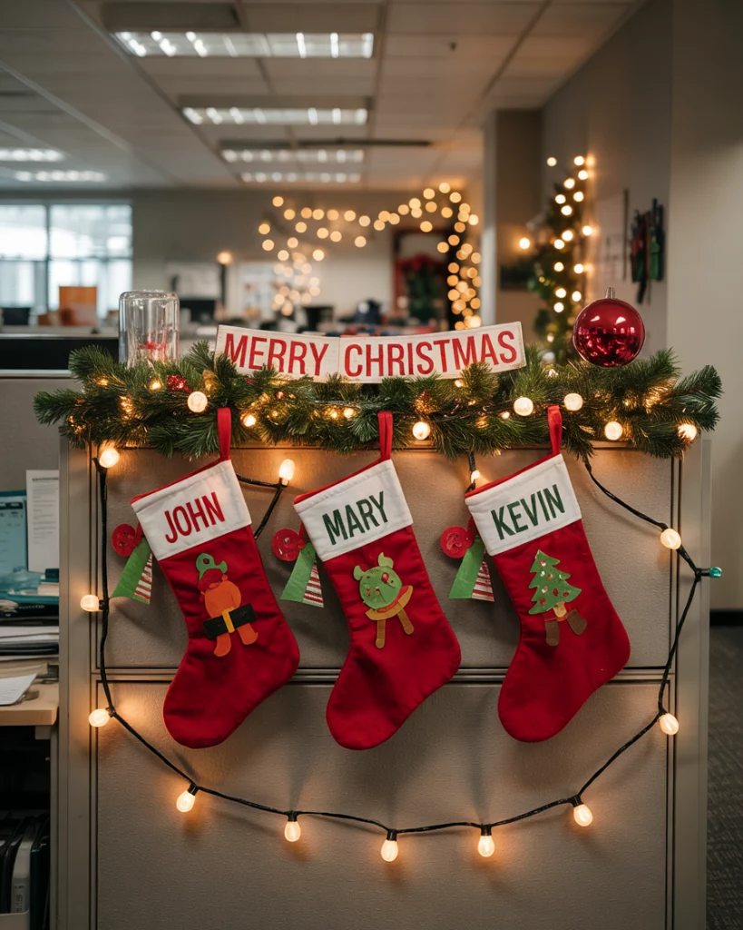 Even your office cubicle deserves a festive touch. Use Dollar Tree faux brick paper, mini stockings, and LED lights to build a “mantel” on your cubicle wall or desk divider. Add a few diy trees and a sign that says “Santa Stop Here.” It’s one of those ideas that’ll spark joy and holiday spirit at work.