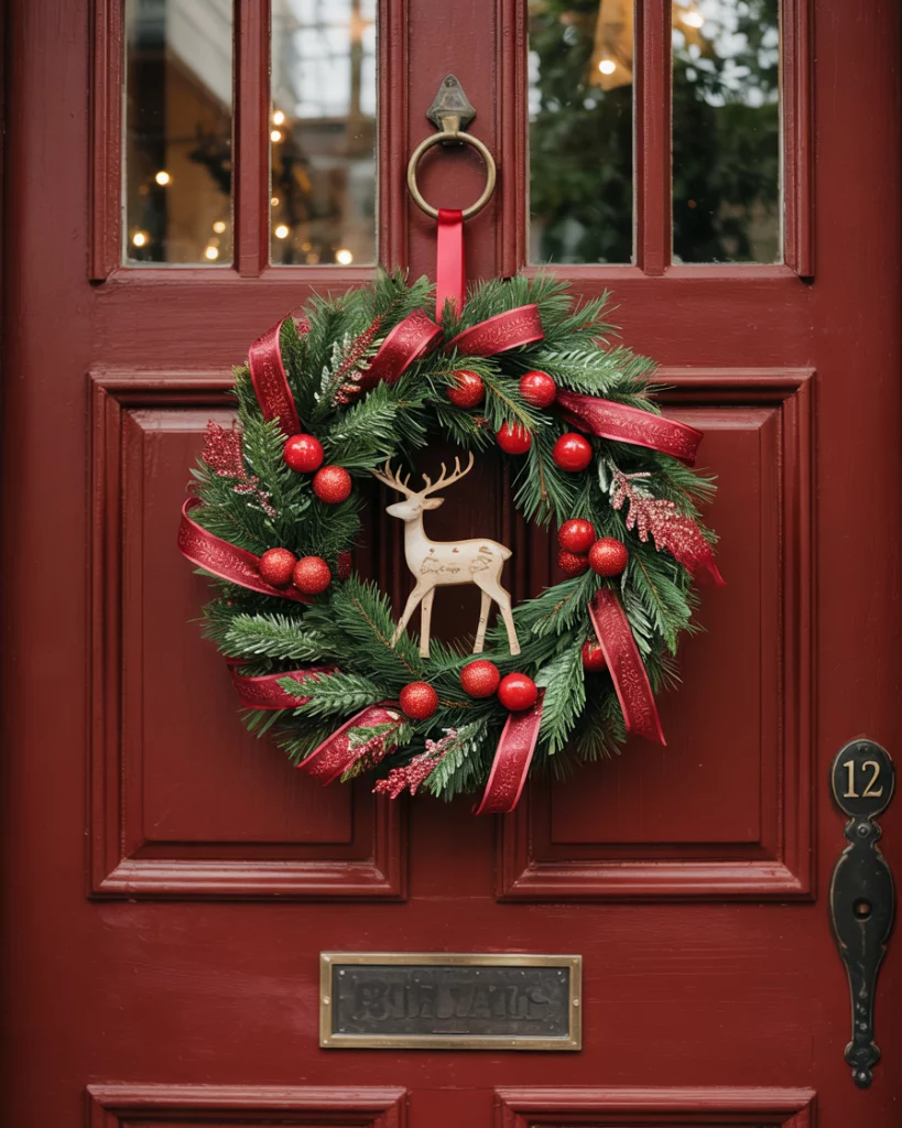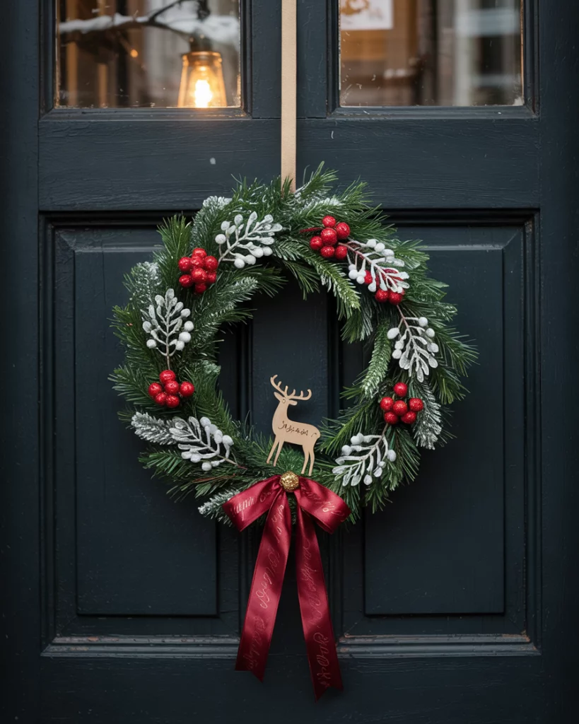 Forget overpriced wreaths — you can make a stunning elegant door decoration using Dollar Tree garlands, bells, and floral picks. Layer a grapevine wreath with silver berries, metallic ribbon, and a glittery bow. Add a hanging deer ornament to complete the look. This is one of those ideas DIY lovers swear by for transforming any front door into a festive statement without the hefty price tag.