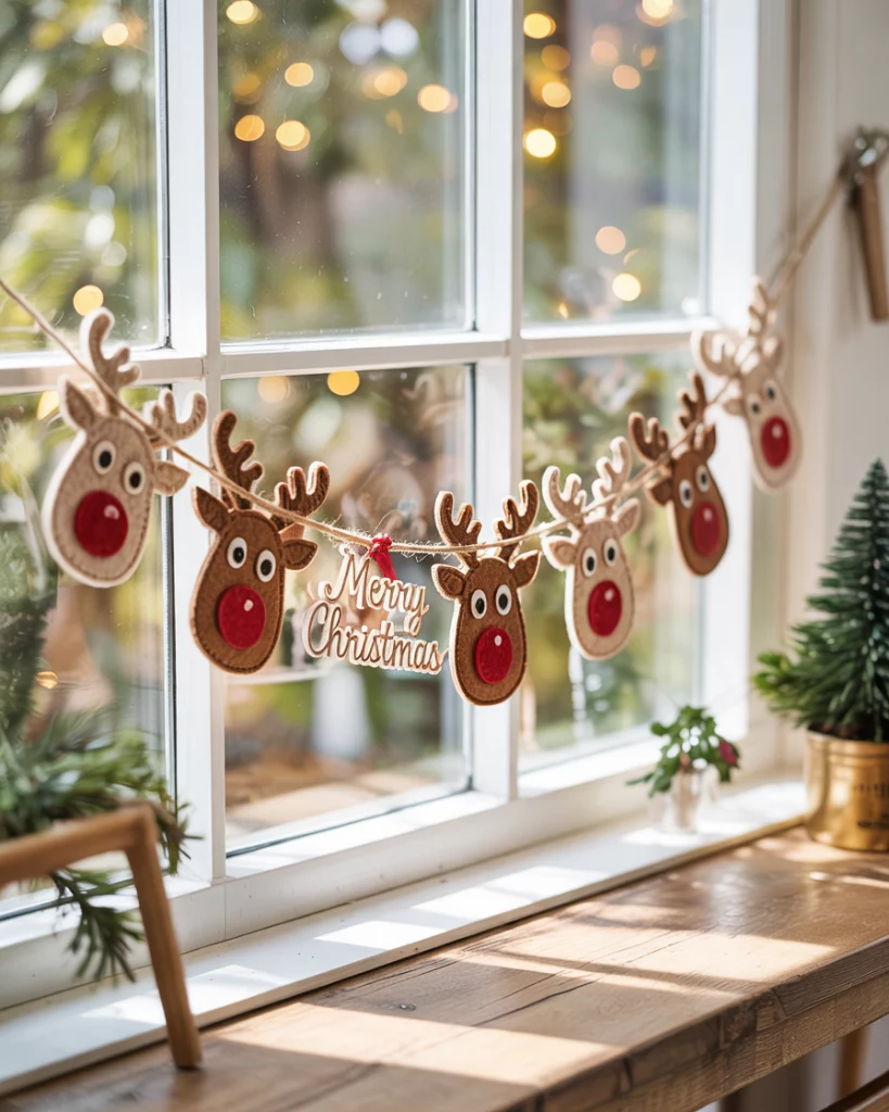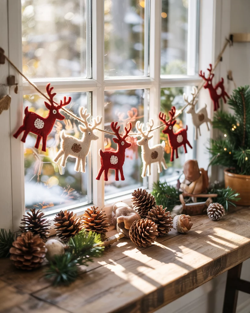 Cut out deer shapes from Dollar Tree felt sheets or use pre-cut shapes, then string them together with ribbon or twine. Add jingle bells or pom-poms for noses. This cute diy garland is great for hanging across windows, doorways, or the front of a table. Kids love helping with this craft idea, and it adds a fun woodland touch to your holiday setup.