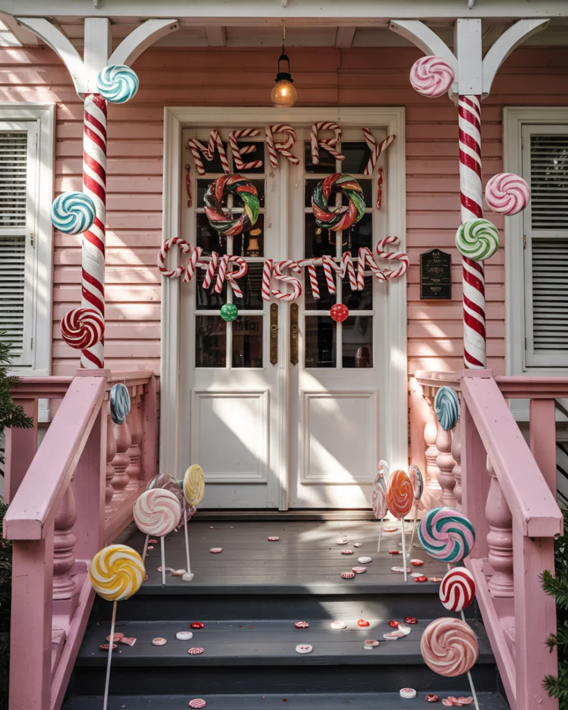 Transform your porch into a candy land by using giant DIY lollipops, peppermint signs, and candy cane stakes from Dollar Tree. Wrap pool noodles in red and white tape for oversized sweets and hang tinsel garlands along the railing. This outdoor theme is playful and cheerful — and very Instagrammable!