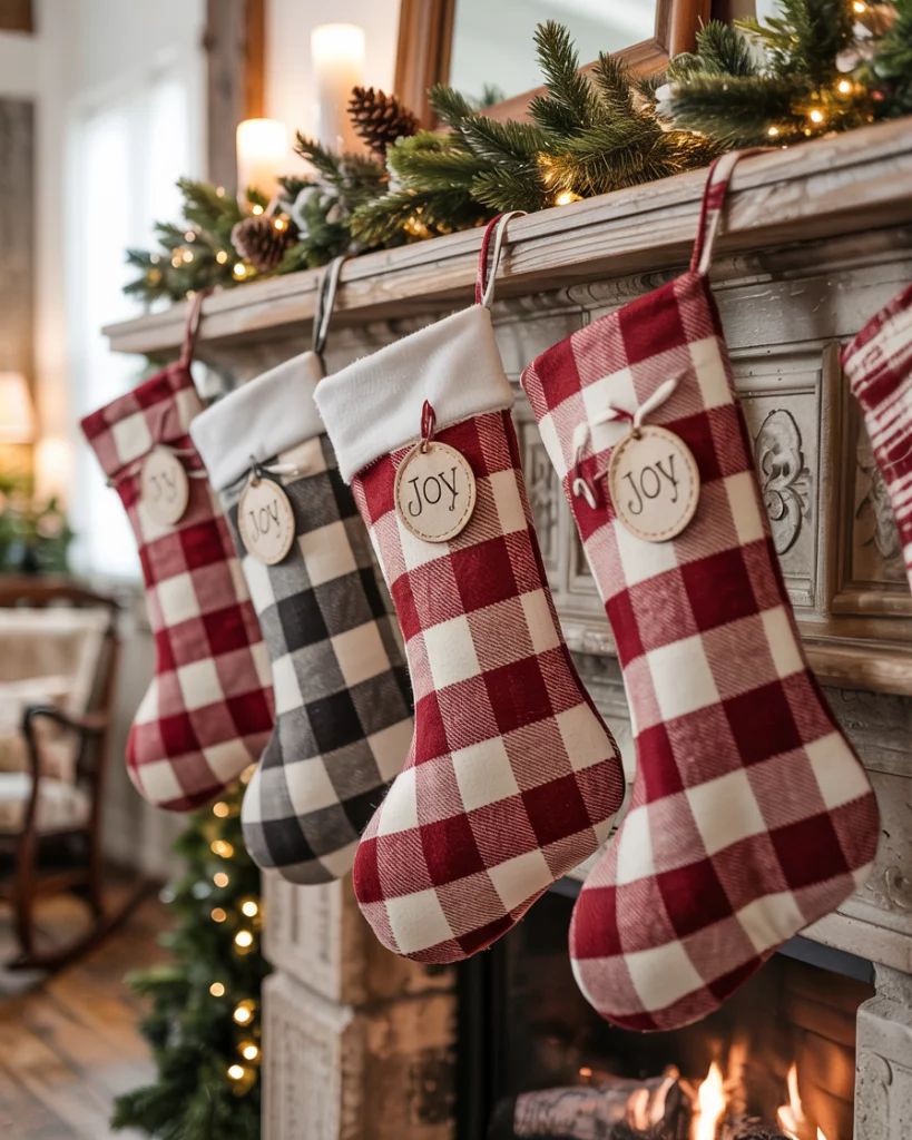 Personalize Dollar Tree’s plain stockings with buffalo plaid fabric and iron-on letters. Add buttons, ribbon, or mini pine sprigs for detail. Hang them by the fireplace or on a door for a cozy farmhouse vibe. This is one of those easy and elegant hacks that elevates cheap materials into boutique-worthy decor.