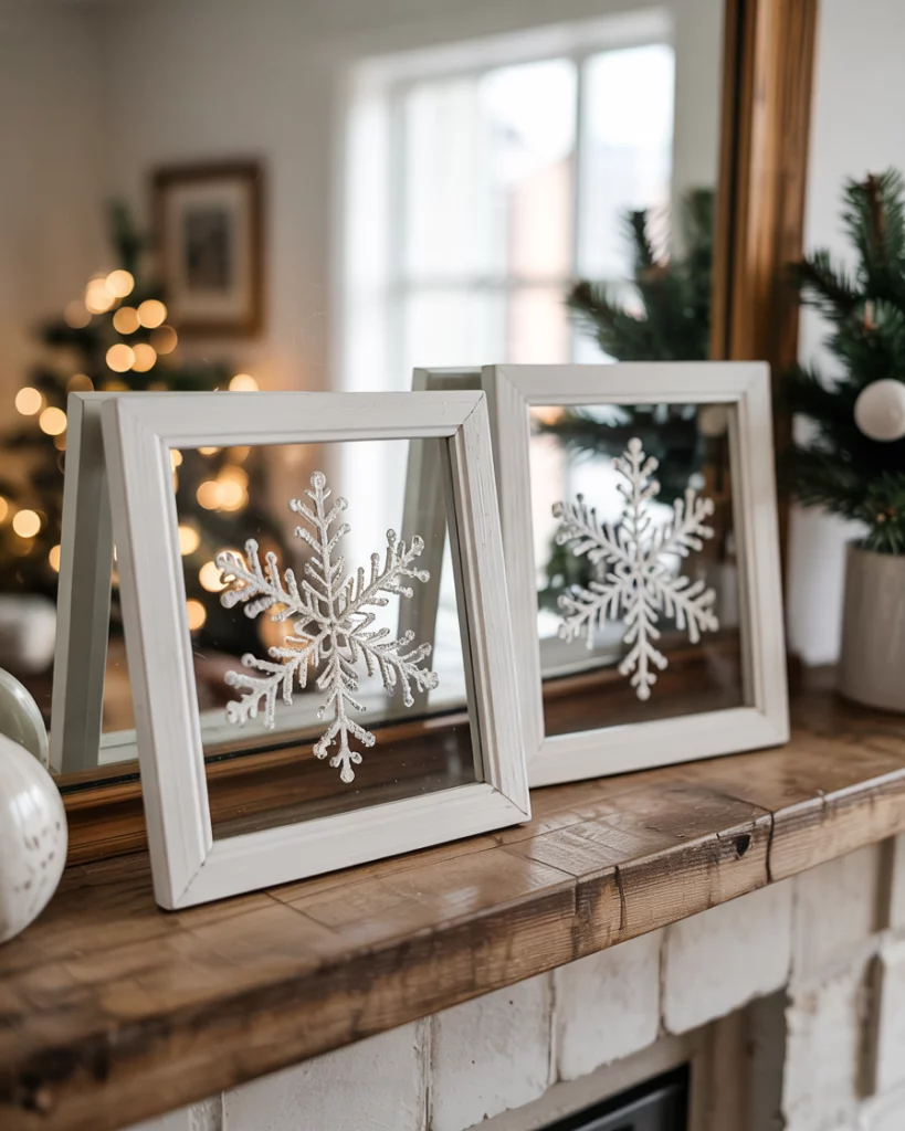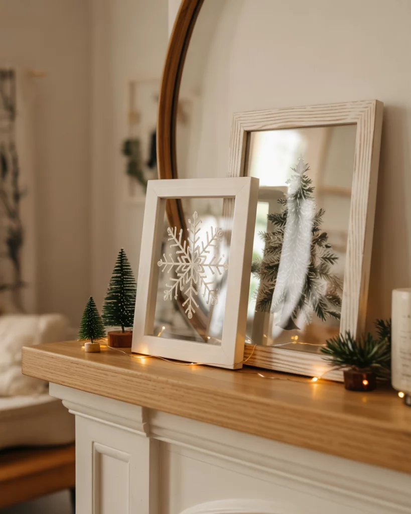 You don’t need a wall full of frames to make a stylish impact. Use just one or two Dollar Tree frames to showcase simple window clings like snowflakes or tree silhouettes. Layer them over burlap or kraft paper for texture, and place the frame on a shelf, mantel, or entry table instead of hanging it. This easy diy project brings subtle seasonal charm into your living room or hallway without overwhelming the space — ideal for fans of minimalist decor on a cheap budget.