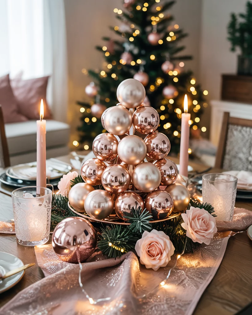 Step away from traditional red and green with a soft pink Christmas tablescape. Use Dollar Tree’s pink ornaments, faux florals, and candleholders to craft a romantic table setting. Layer white plates with pink chargers, and tuck in pink napkins tied with mini candy canes. It’s a perfect mix of modern and whimsical — one of the more unique craft ideas that’ll wow your guests.