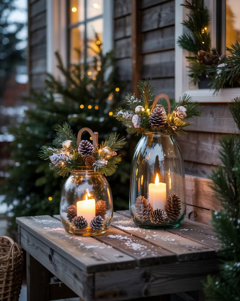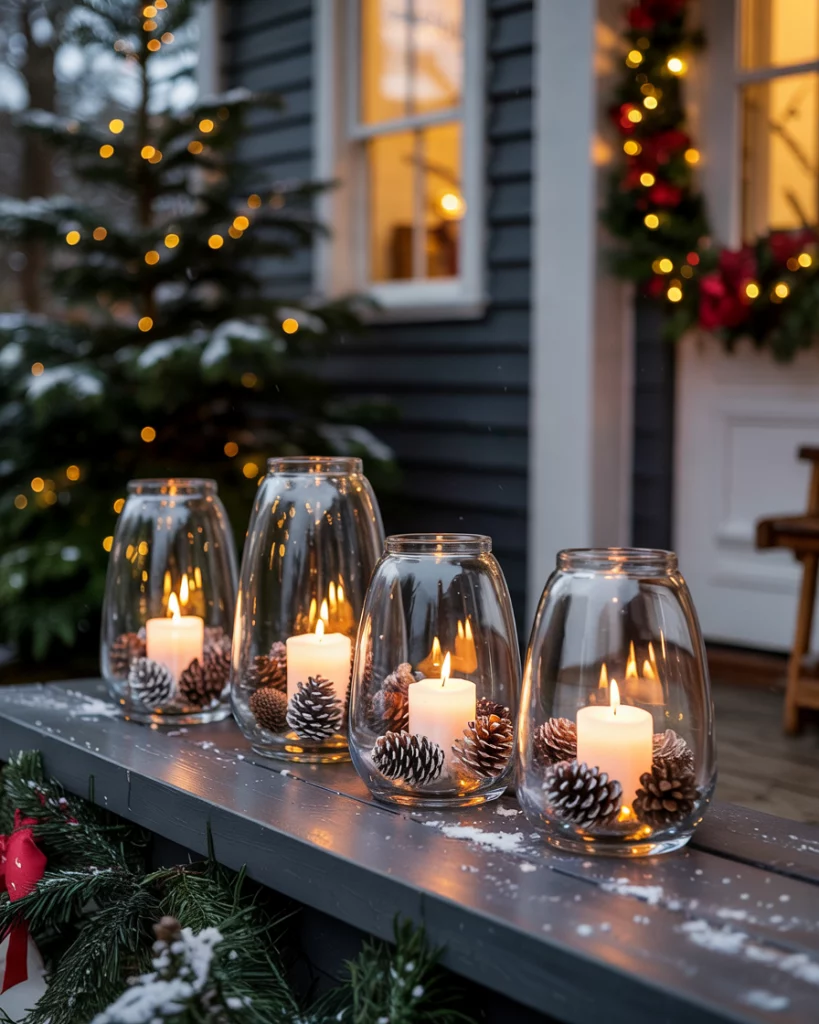 Create glowing outdoor lanterns for your porch using glass vases, battery-powered candles, and faux snow. Place pinecones and mini ornaments inside for a cozy touch. Line these up on your porch steps for that magical welcome-home moment. This easy and affordable idea brings holiday warmth to the outside of your house — it’s proof that you don’t need to spend a fortune for stunning curb appeal.