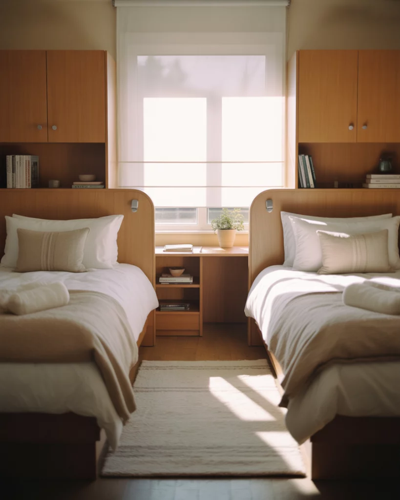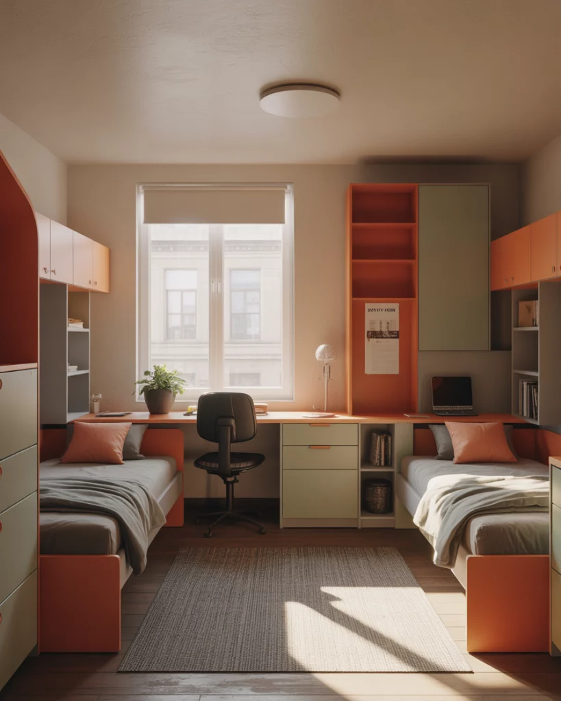 Designing a shared dorm. This idea focuses on symmetry for the organization, divided storage, and coordinating decor so both roommates feel equally at home. To decrease visual chaos, try to match bed heights and mirror layouts. This is a student-scaled reflection of homeowner behavior. People naturally take care of spaces more when the boundaries are clear. The same psychology applies to dorm rooms with shared responsibilities.