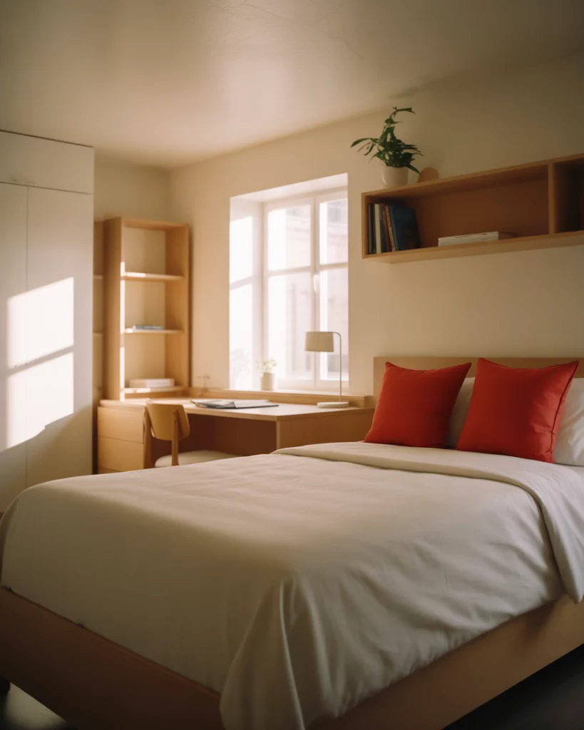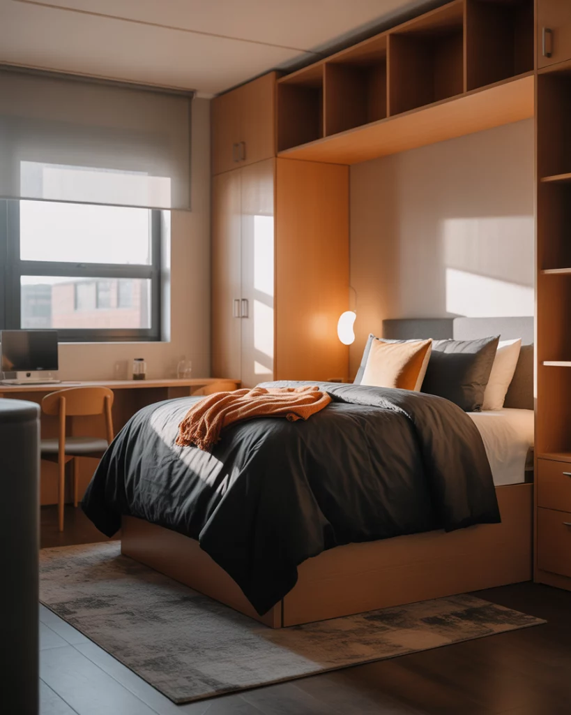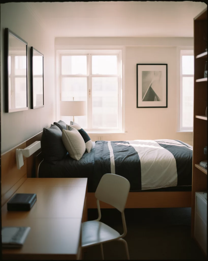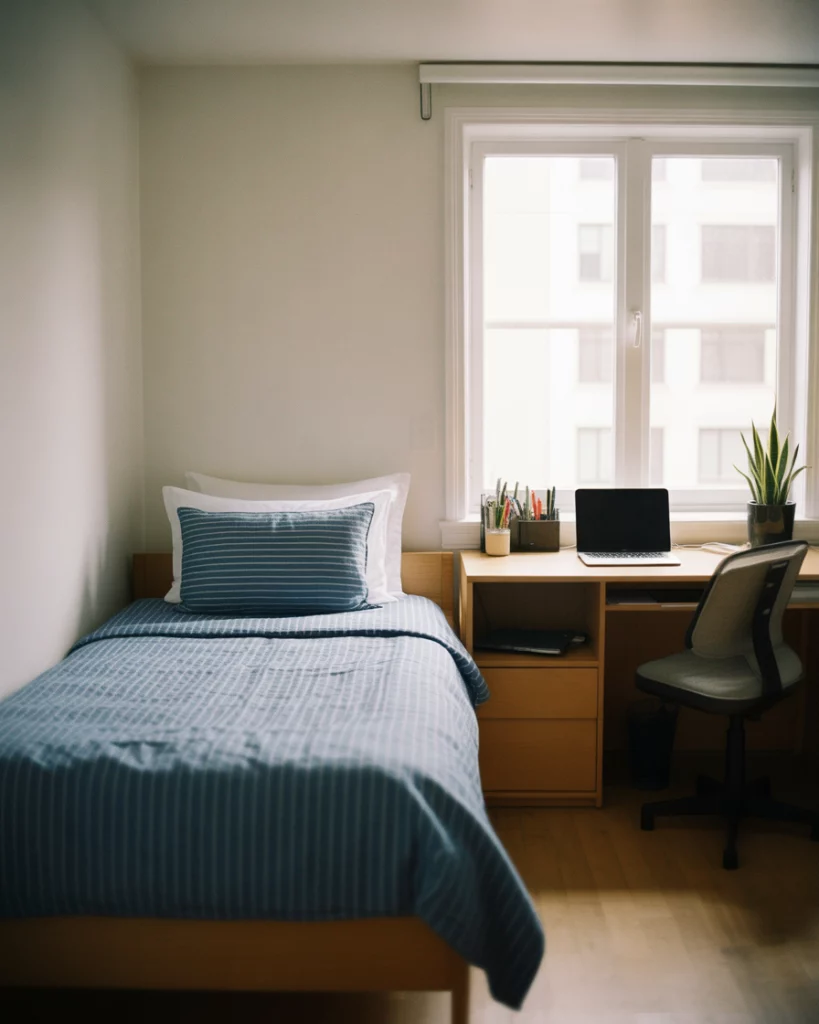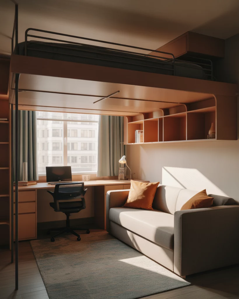 Using a lofted bed transforms how a dorm functions. By lifting the bed, students gain space for seating, storage, or a desk underneath. This approach is especially popular for small room setups where every square foot needs to earn its place. A common mistake is overcrowding the area beneath the bed. Keeping one clear function—study or lounge—prevents the space from feeling cramped and maintains good airflow, which matters more than students expect.