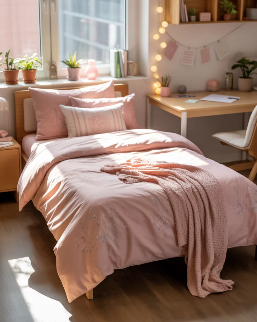 A dorm doesn’t have to feel temporary to feel pulled together. This idea leans into a college mindset with a pink, cute palette that feels calm rather than childish. Blush bedding, pale wood accents, and soft task lighting create a space that works equally well for late-night studying and slow weekend mornings, especially in standard dorm layouts. The value here is emotional comfort. Students often underestimate how color affects stress levels, especially during exam weeks. Soft pinks tend to photograph well and reflect light nicely, making even older dorm buildings feel brighter and more personal without overwhelming the room.