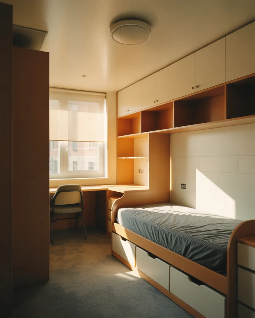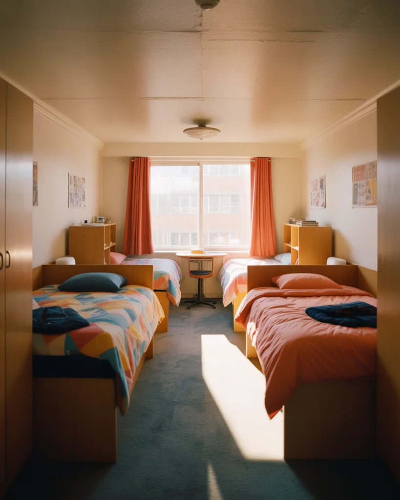 This triple dorm uses subtle color variation and layout planning to define personal zones. Each bed area feels distinct, while shared storage and lighting maintain cohesion across the room. A micro anecdote often heard from students: once zones are visually clear, roommate conflicts tend to drop. Design quietly supports better communication.