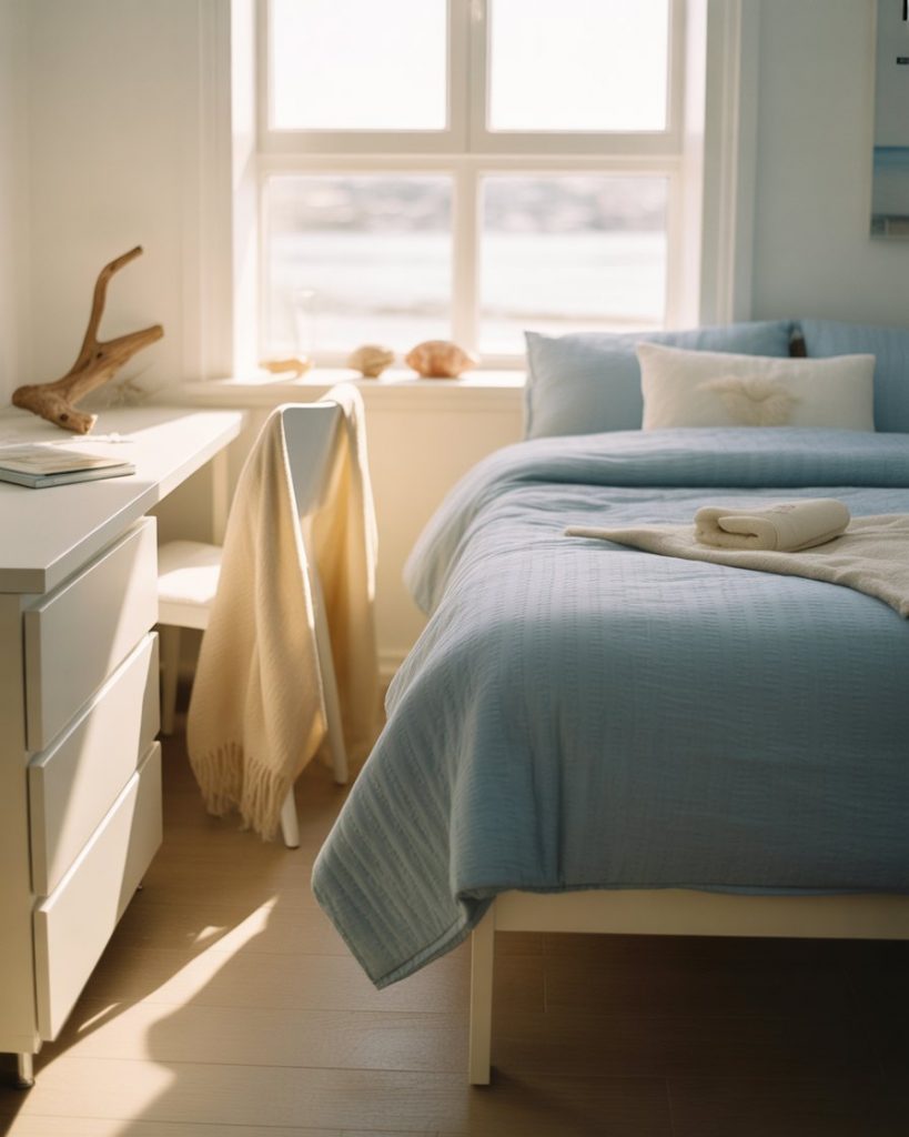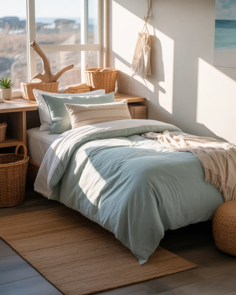 A laid-back, beach-inspired dorm uses soft neutrals, light blues, and natural textures to create an easygoing vibe. The look feels airy and relaxed without relying on obvious coastal motifs. Where it works best is in high-stress academic programs. Visual softness can subtly counterbalance intense schedules and long study hours.