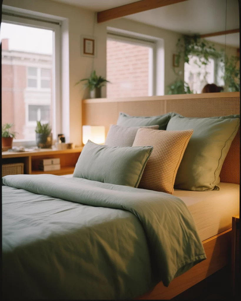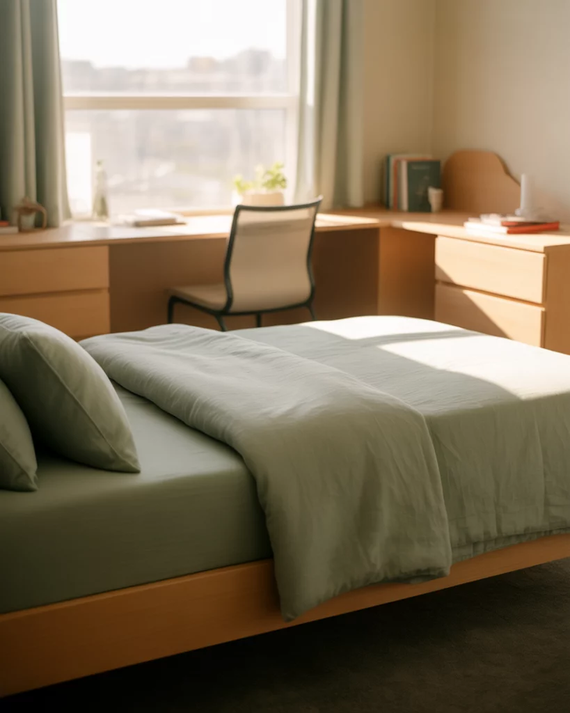 This look taps into a growing love for grounded palettes using green, earthy, and sage green tones. Think linen textures, muted throws, and simple plants that soften the edges of a dorm room. It’s a natural fit for students who want a peaceful, almost grown-up space that still feels warm and approachable. Where this works best is in dorms with limited natural light. Earthy greens don’t rely on bright sunshine to look good and pair easily with beige or off-white walls commonly found in American campuses.
