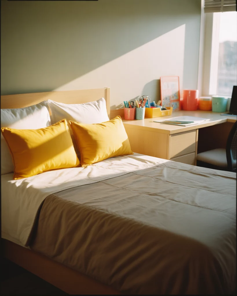 When used thoughtfully, yellow can completely change the mood of a college dorm. This idea layers sunny accents—pillows, throws, or desk accessories—into a mostly neutral base. The result feels optimistic and energizing without overwhelming a small space. Where it works best is in northern campuses with long winters. A touch of yellow compensates for limited daylight and subtly boosts mood during darker months.