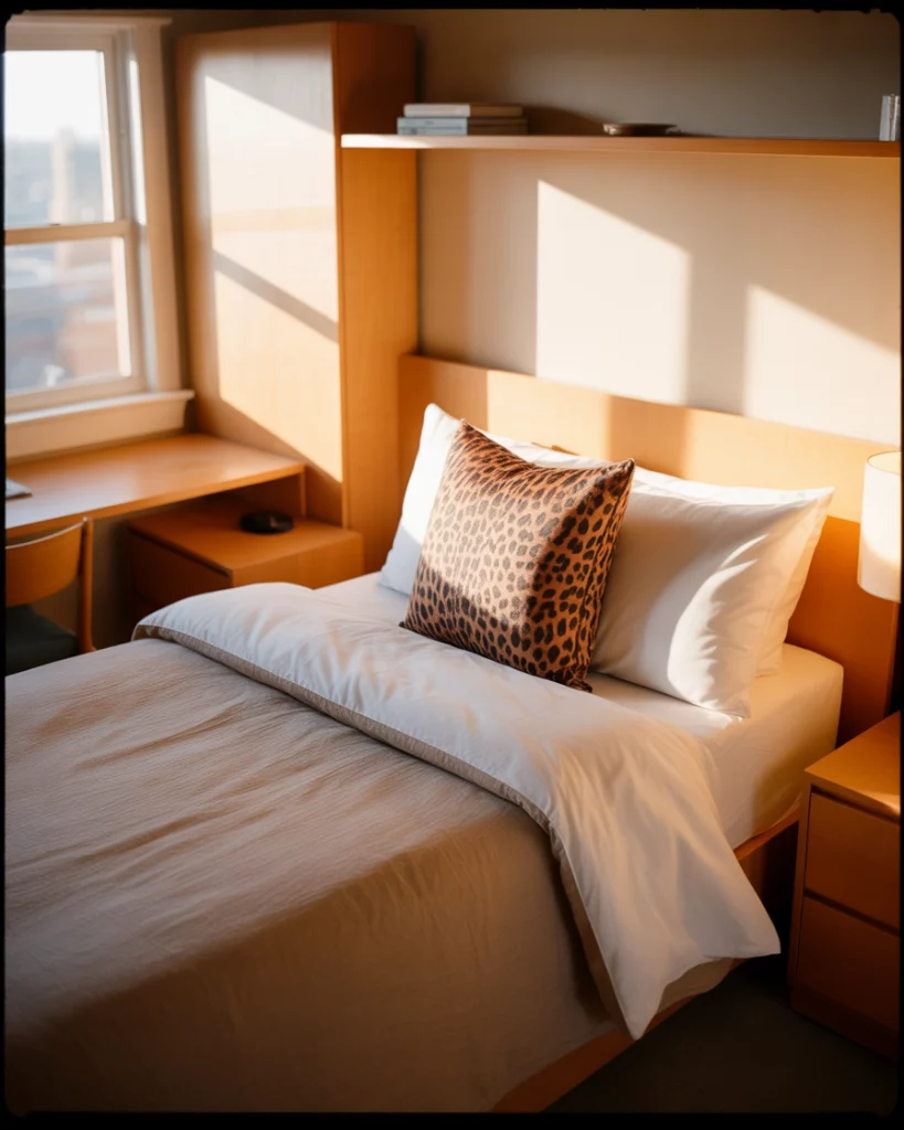 This look is for students unafraid of personality. A cheetah print used sparingly—on a pillow, ottoman, or throw—adds edge to an otherwise neutral dorm. The contrast keeps the room playful yet controlled, perfect for bold tastes. A common mistake is overcommitting to the pattern. Limiting cheetah to one focal accent keeps the look intentional and avoids visual fatigue in a small dorm environment.