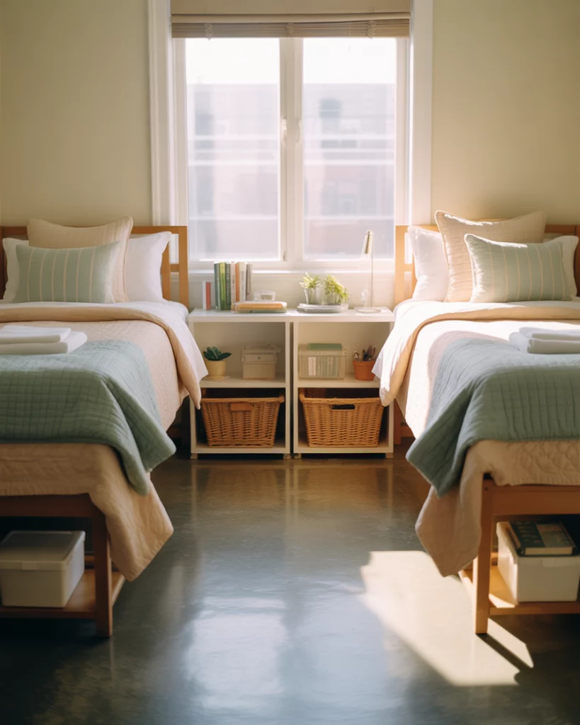 A double dorm styled in soft neutral tones instantly feels calmer and more spacious. Layered whites, beiges, and light wood finishes create visual continuity between roommates while still allowing personal accents. This approach works well for students who want a grown-up look without sacrificing warmth or comfort. Where it works best is in older dorm buildings with mismatched finishes. A neutral palette smooths out inconsistencies and makes the room feel intentionally designed rather than patched together.