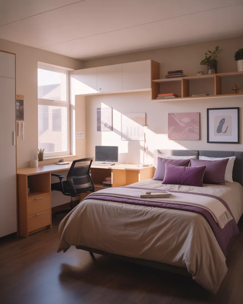 For students who want color without clutter, purple works beautifully as an accent. Paired with a largely neutral base, it adds personality without overwhelming the room. Think throw pillows, desk chairs, or wall art that can be swapped out easily. An expert-style takeaway: accent colors are easiest to update year to year. Investing in neutral foundations and layering trend-driven hues keeps dorm refreshes affordable and flexible.