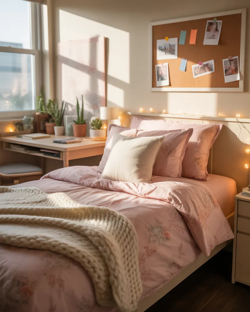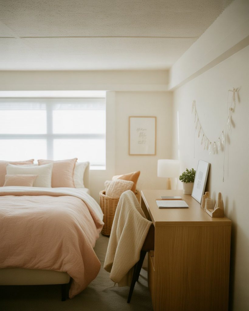 A dorm doesn’t have to feel temporary to feel pulled together. This idea leans into a college mindset with a pink, cute palette that feels calm rather than childish. Blush bedding, pale wood accents, and soft task lighting create a space that works equally well for late-night studying and slow weekend mornings, especially in standard dorm layouts. The value here is emotional comfort. Students often underestimate how color affects stress levels, especially during exam weeks. Soft pinks tend to photograph well and reflect light nicely, making even older dorm buildings feel brighter and more personal without overwhelming the room.